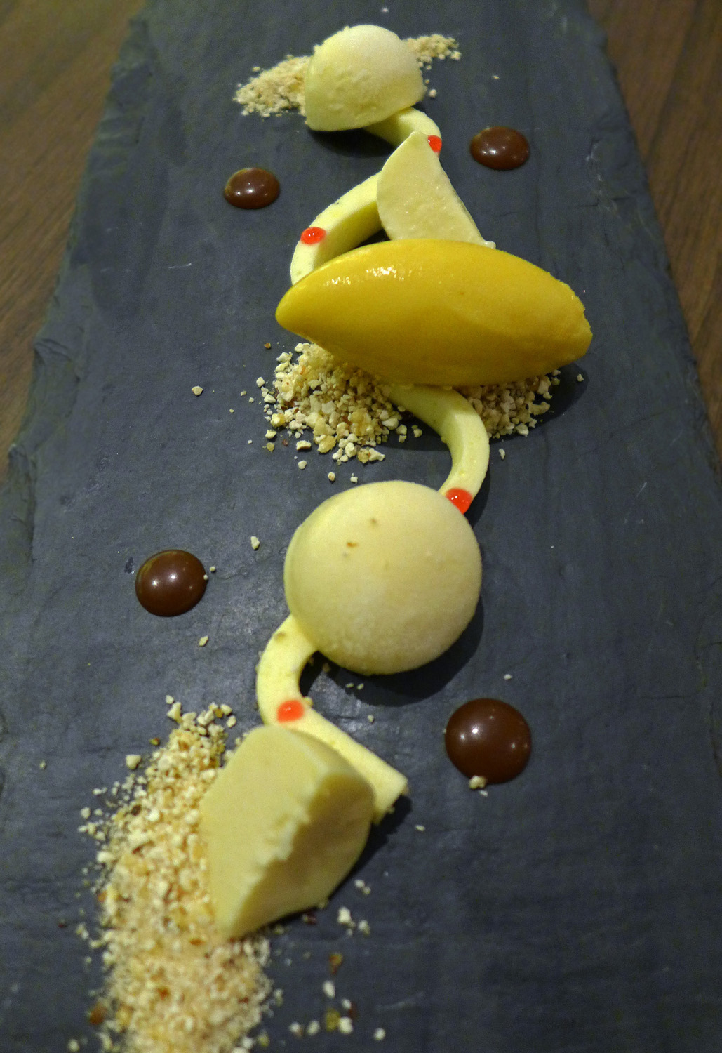 Kayambe H20 Chocolate – 72% Dark Michel Cluizel Chocolate , Salted Caramel mousse , Evian , Yuzu sorbet. – Chocolate , Caramel and Lemon…. It simply works perfectly.