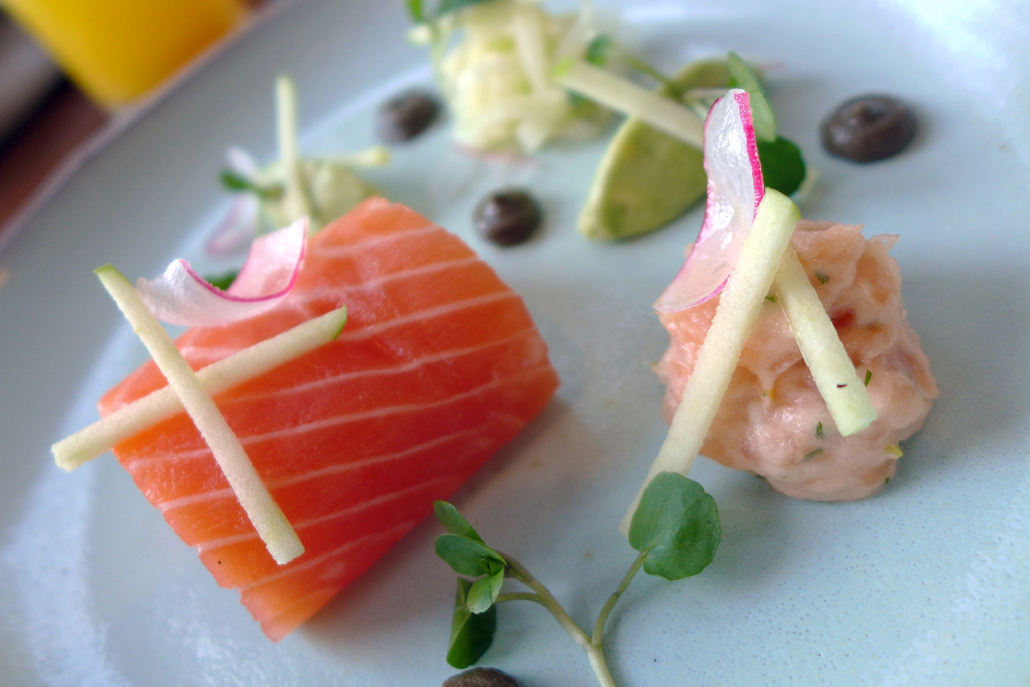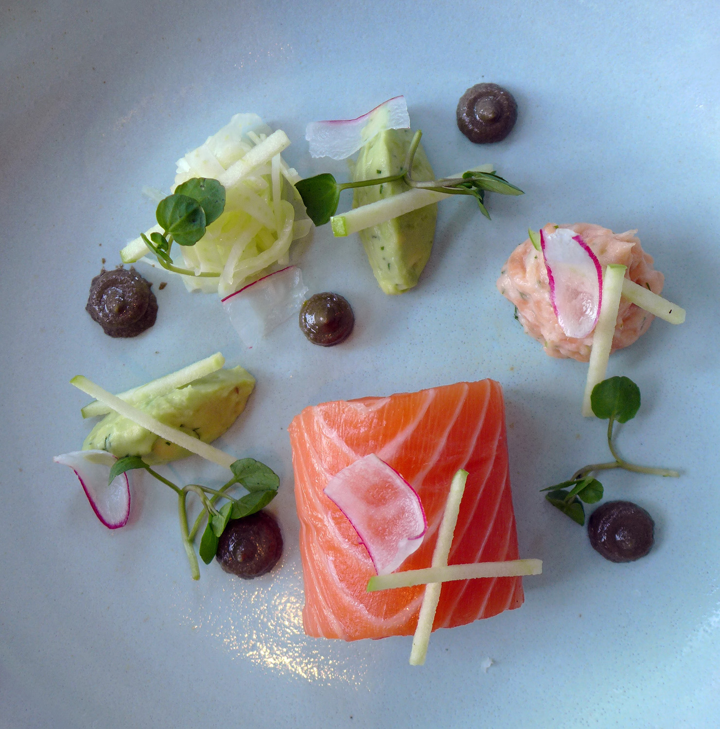 Cured Local Salmon – Yorkshire Asparagus, Almond , Olive , Apple