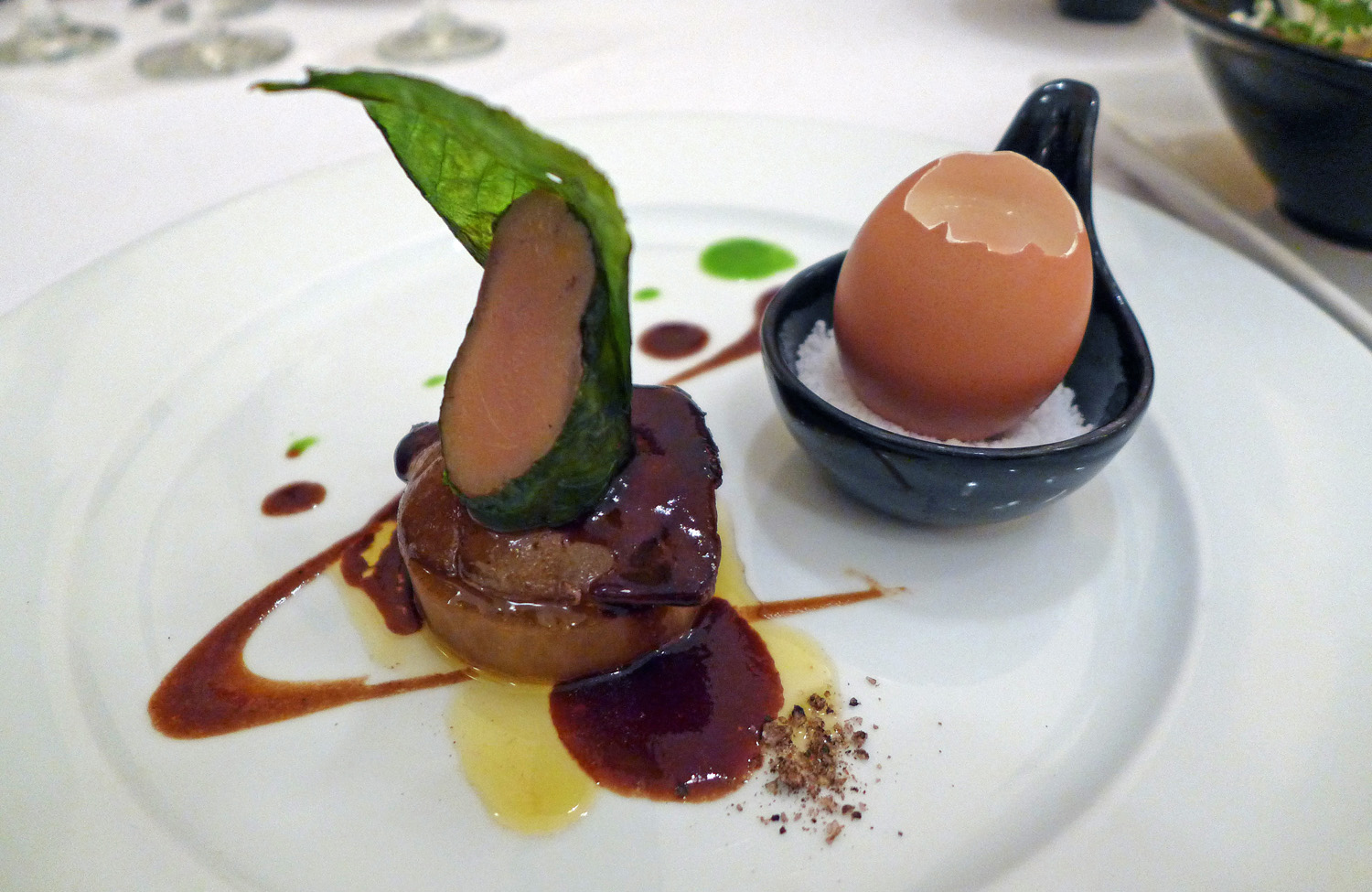 Foie gras of Mulard Duck with green tea, Pho stock, egg, bitter cacao powder