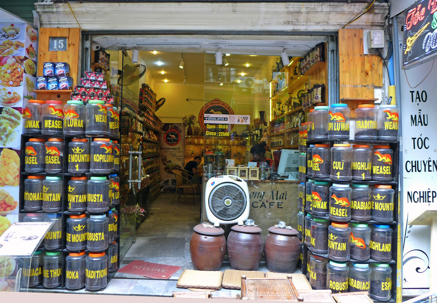 _DSC0675  _DSC0720 20140826_161659    20140827_203341  20140828_143755 Huong Mai Coffee shop on Hang Manh street in the Hoan Kiem area. This is one of the premier Coffee shops in Hanoi. As you can see , they stock everything here and I ended up spending a small fortune on Blue mountain beans and the traditional Indonesian Organic Kopi Luwak .( better known as Cat Shit Coffee )