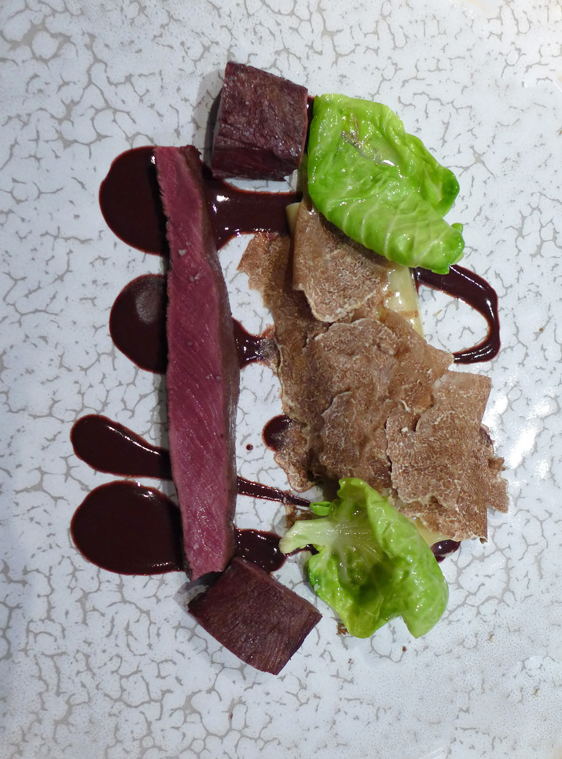 Hare , Red wine , Chocolate , Sprouts , White Truffle –  Gamey , very rich and classic flavours. Very much a luxury and very expensive plate of food which was superb to eat….but next time no Truffles.