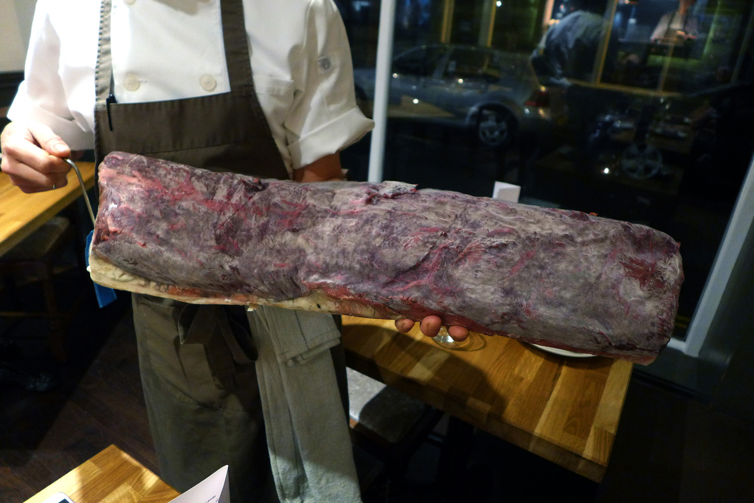 Since my first visit to Lake road kitchen in Ambleside a couple of months ago there`s been a very special piece of Beef hanging in the fridge with my name all over it. I was so tempted to return earlier to try it but a reservation had been entered into the restaurant diary on the day that the Beef had been maturing for 125 days. Yes folks , it`s not a typo….One hundred and twenty five days. To my knowledge there`s nowhere in the UK that hangs their meat for this length of time. The only one that I could find was Thomas Keller in the USA who serves 140 day old Beef….and where did our Lake road kitchen Chef and owner work ? …..Thomas Kellers `Per Se` in New York. Ok , so let me explain. Chef James Cross buys his Beef somewhere between 70 and 80 days old from his supplier. It then gets trimmed up and put on a hook in the fridge at 3 degrees. At this temperature the nasty organisms cannot breed and so the natural ageing process evolves. Every few days the piece of Beef is taken down and scrubbed with salt , bathed , air dried and rehung again. You`ll notice that there`s a natural “Bloom” appearing on the meat from the photo below.