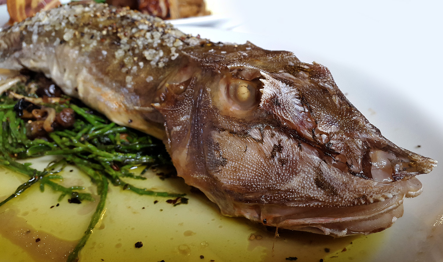 This poor guy aint a pretty sight but chef made the very best of a poor mans fish , the Gurnard. Roasted and basted in sea salt and butter then served on a bed of local Samphire and wild mushrooms.