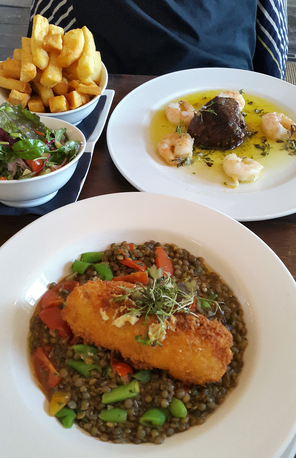 Just a little look at our Cumbrian portion control….no complaints here then. I went for the Monkfish Kiev on yellow Pea and green lentil ragout. My son Max had the Cumbrian surf n turf. Fillet steak , Garlic prawns , Chips and salad.
