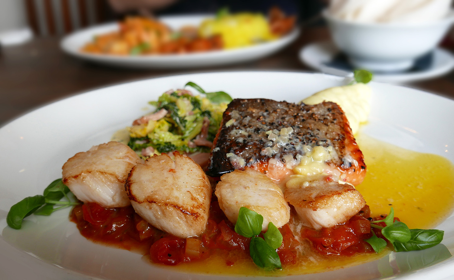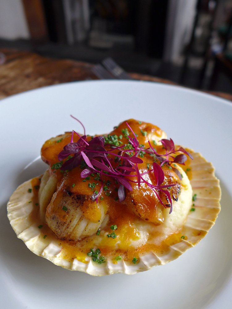 This one is easily my favourite main course at the Inn. Griddled Irish sea Scallops on a light Apple chutney. Pan fried sea Trout on Buttered Cabbage and Bacon with creamy mash and a Beurre blanc sauce.