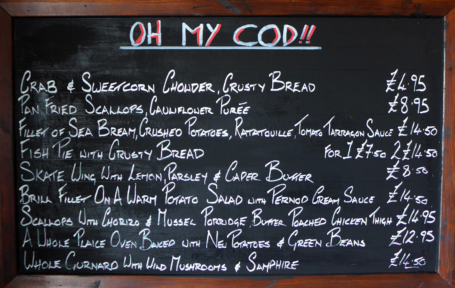 Menu boards at the Inn are hand written in the kitchen once the daily catch is brought through the door. On my last visit , Chef was actually waiting for the catch of the day to arrive minutes before service kicked off. “ In Cod we trust” , “ Skate , Rattle and Sole” and “Not bad , Cod do better” the three specials boards are crammed to capacity with fresh seafood . Many restaurants would be blessed to have the one of these boards.Thanks to Steve Hallet from Ravenglass fish for braving the cold Cumbrian seas. You can follow this crazy guy on his Twitter account HERE.