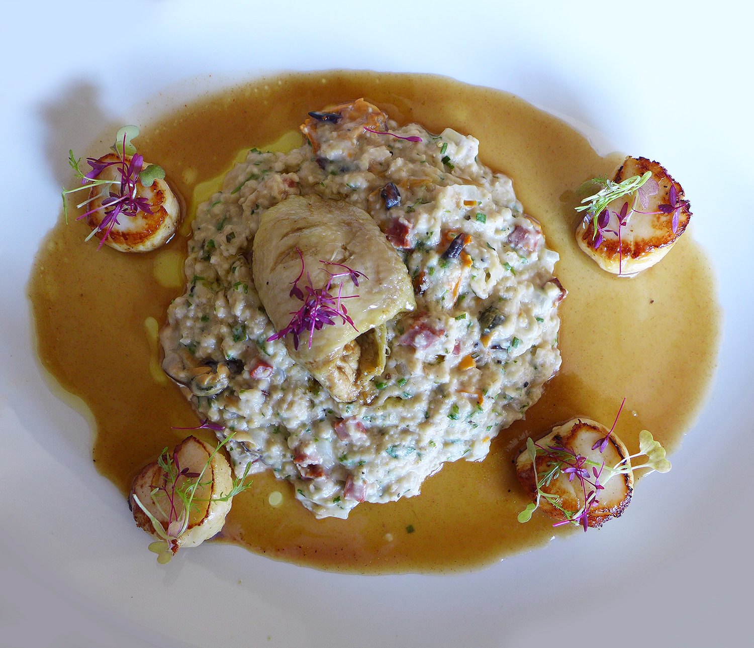 Irish sea Scallops , Chorizo and Mussel Porridge with Butter poached Chicken thigh.
