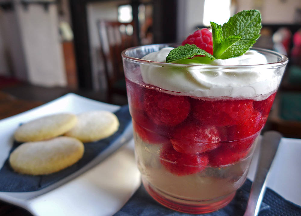 Fresh Raspberries set in Elderflower jelly with home bakes Shortbread.