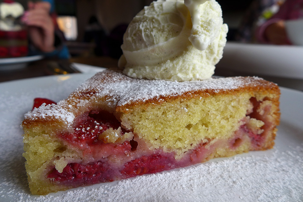 Strawberry cake , vanilla ice cream.