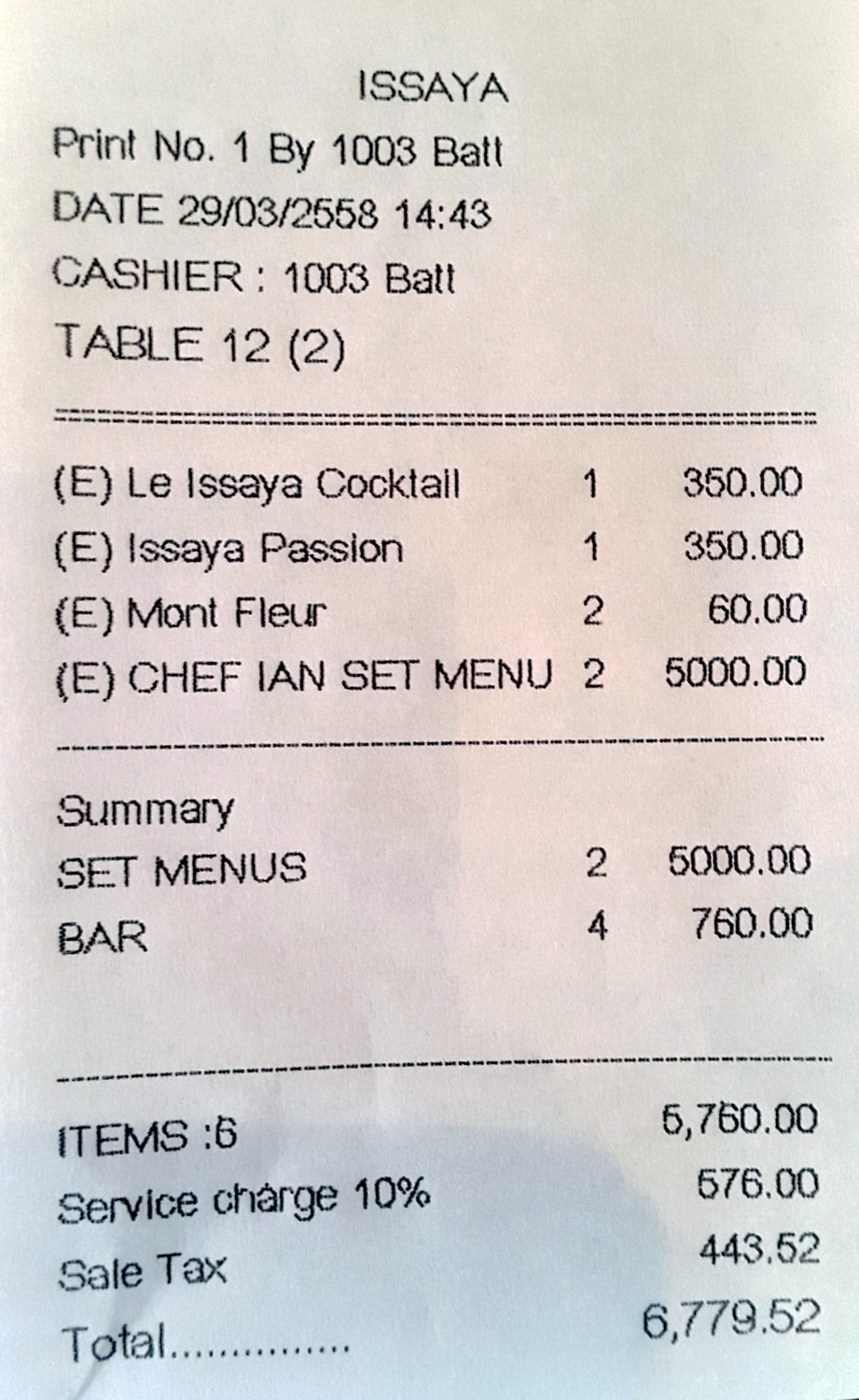 And so for the bill – Quite an attractive price for Chefs Tasting menu using prime ingredients, a decent sized Lobster, Cocktails and bottled water set us back 2,880 baht each ( £56 / $87 ). Well worth a visit to eat the food of a Chef right at the top of his game – Highly recommended.