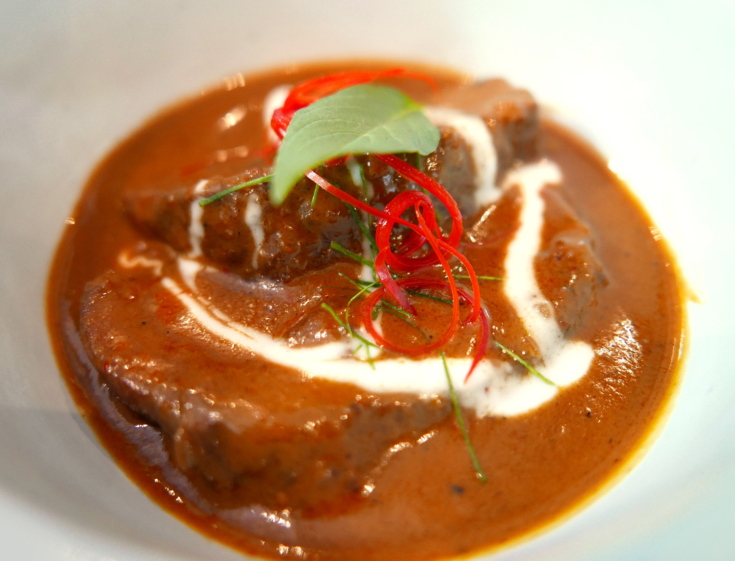 Grain fed Australian Veal cheek simmered in house blended spices , Hand pressed Coconut Milk and Kaffir Lime leaves.