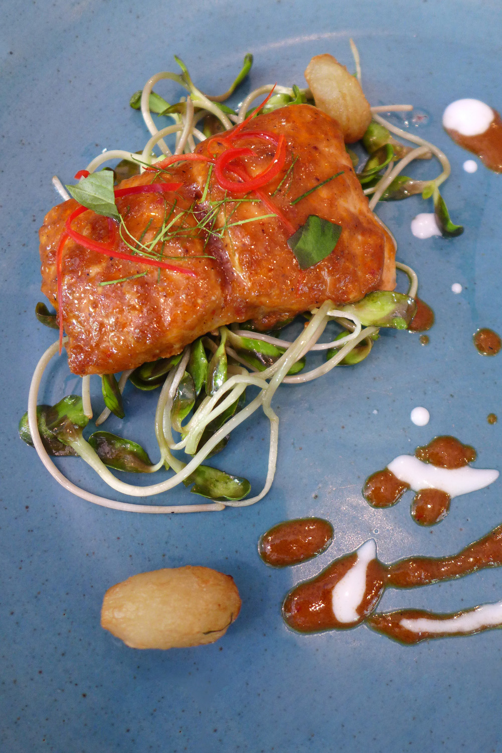 Slow cooked smoked Salmon with Jerusalem Artichokes from Chokchai farm in a home made Red Curry sauce.