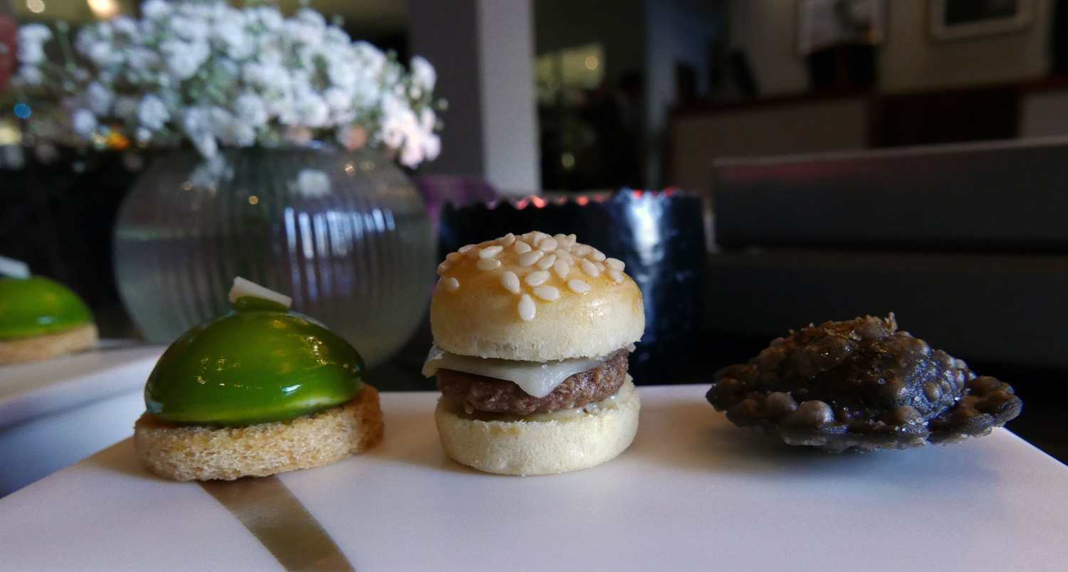Liquid Caesar salad , Caper & Cumin Burger and Salt Cod barbajuan.
