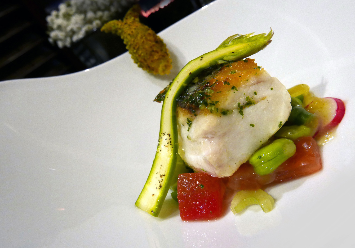 Roasted fillet of North sea Hake , vegetables and Lemon / Lime sauce.