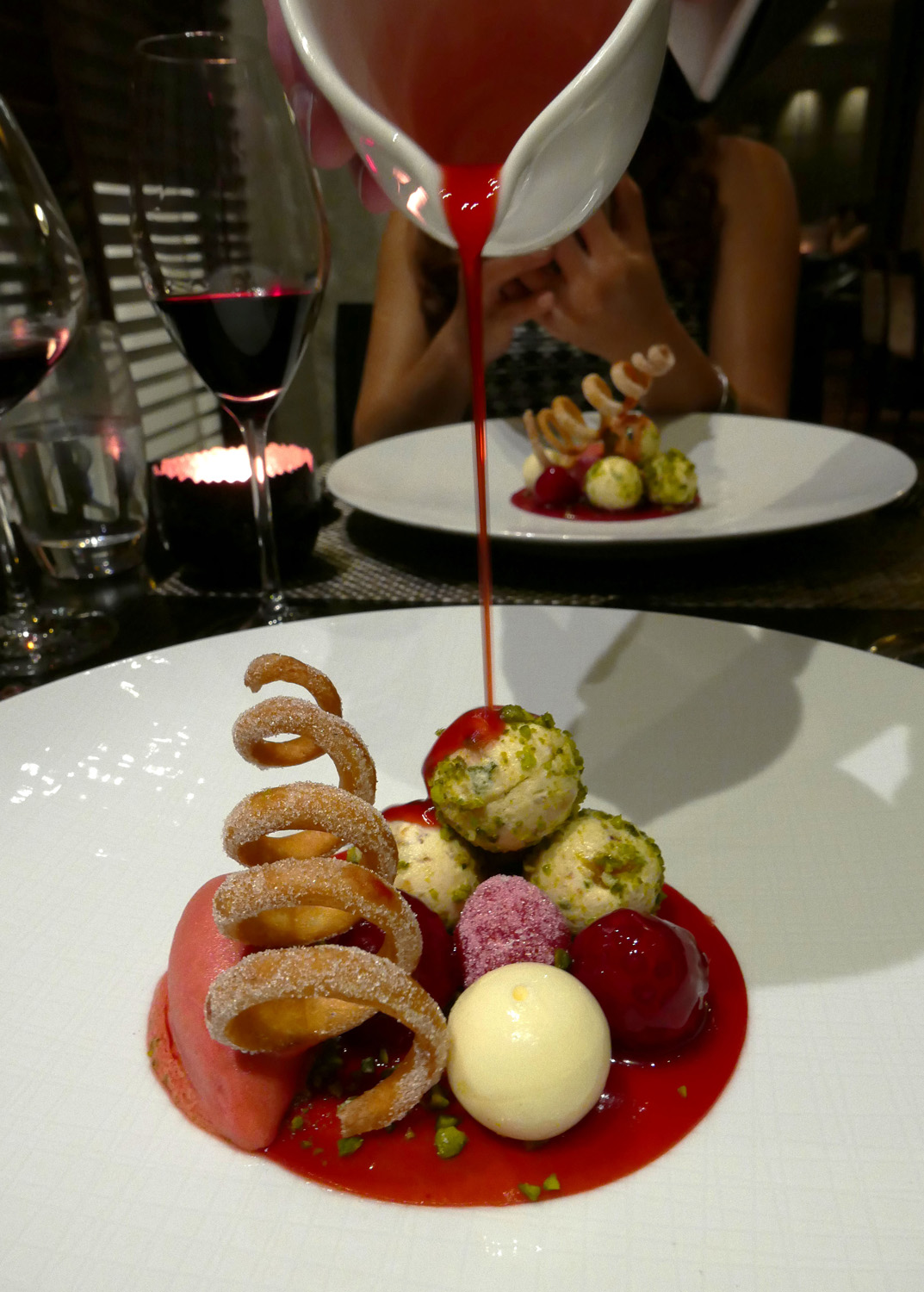 A selection of Blackeytside Farm raspberries with nougatine parfait and crispy doughnutcastle terrace , edinburgh