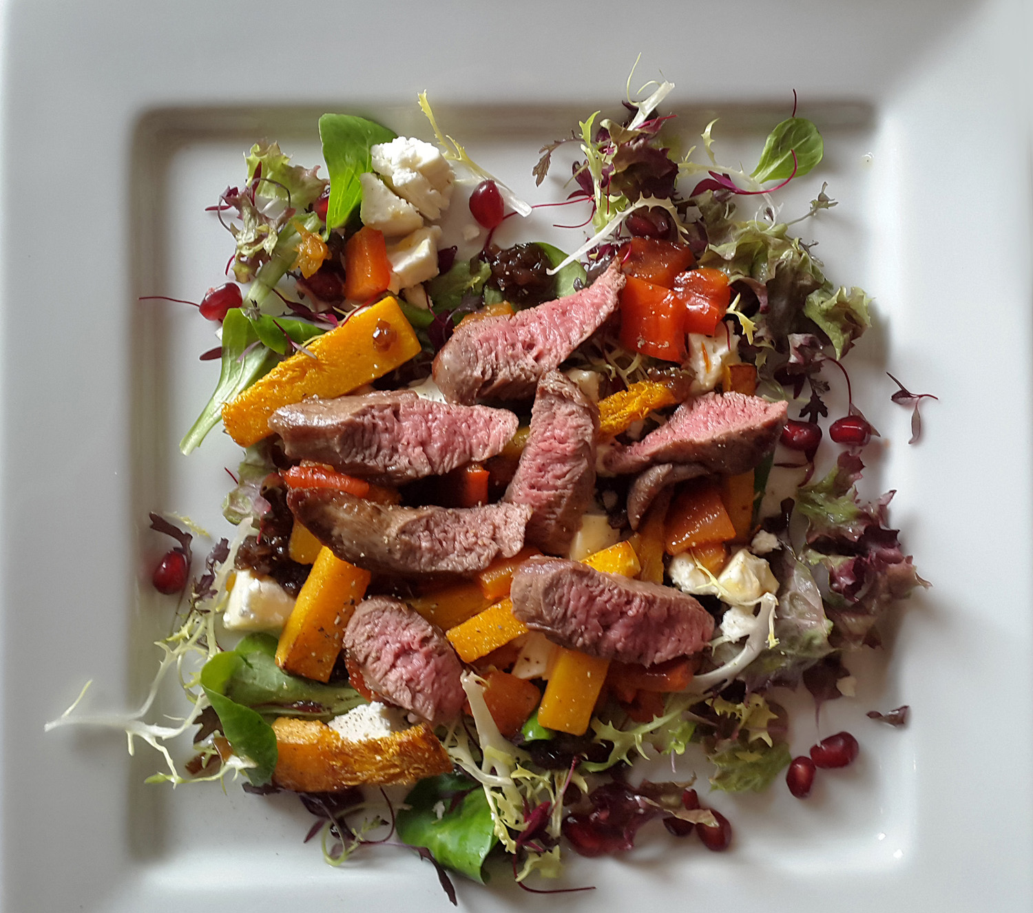 First course was a Cumbrian fillet of Herdwick Lamb salad with Roasted Red Peppers , Feta Cheese , roasted Squash , Pomegranate seeds and a Balsamic dressing. Nice sized portion for a starter with freshly baked Bread. Absolutely no complaints here and off to a nice start.