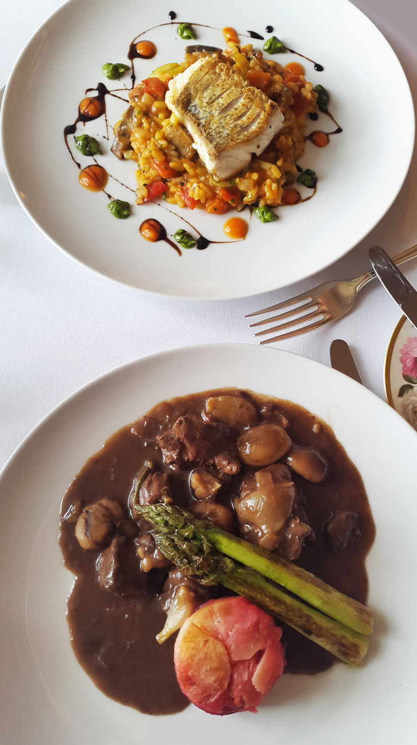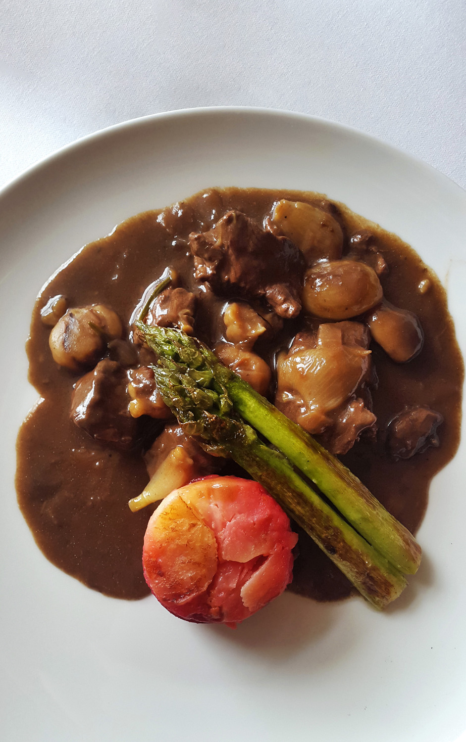 Casserole of local Matterdale Venison , Chestnuts , roasted Shallots , Beetroot Dauphinoise and roasted Asparagus. I could definitely have eaten the same again…Rich `bloke` food , loved it.