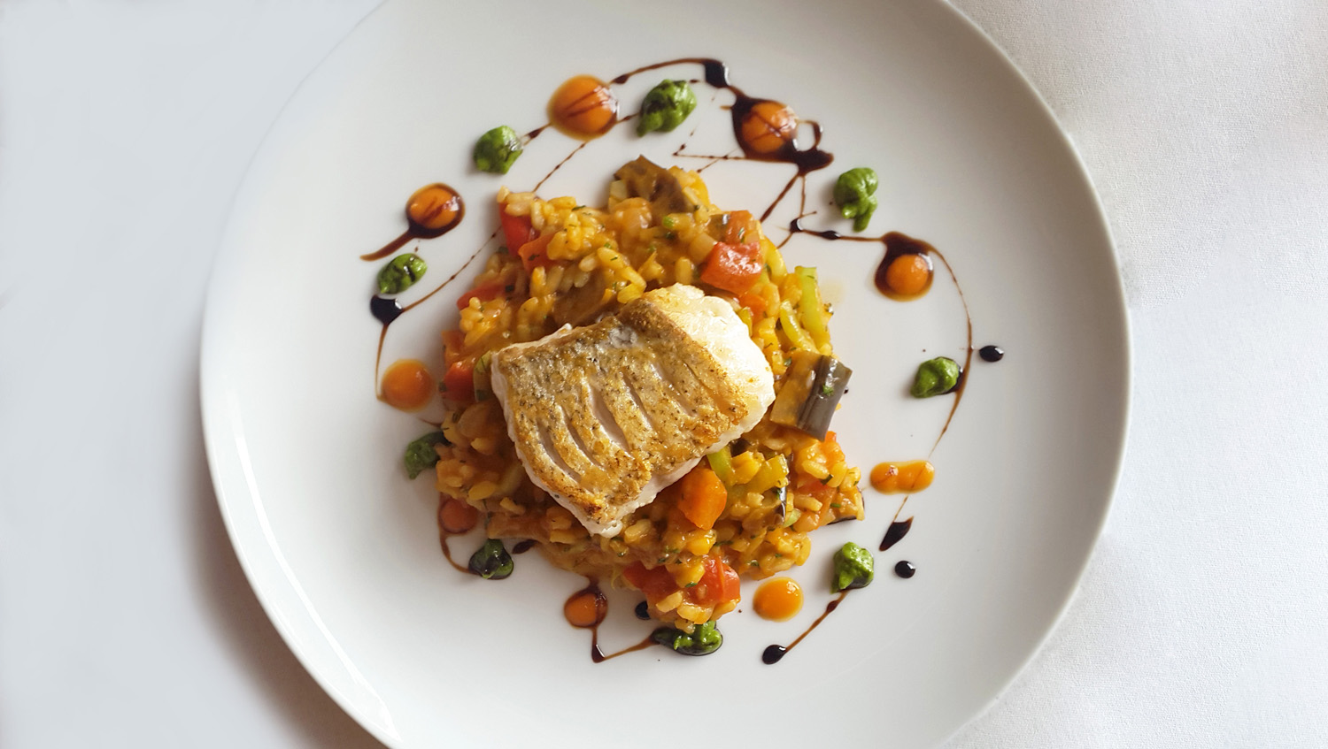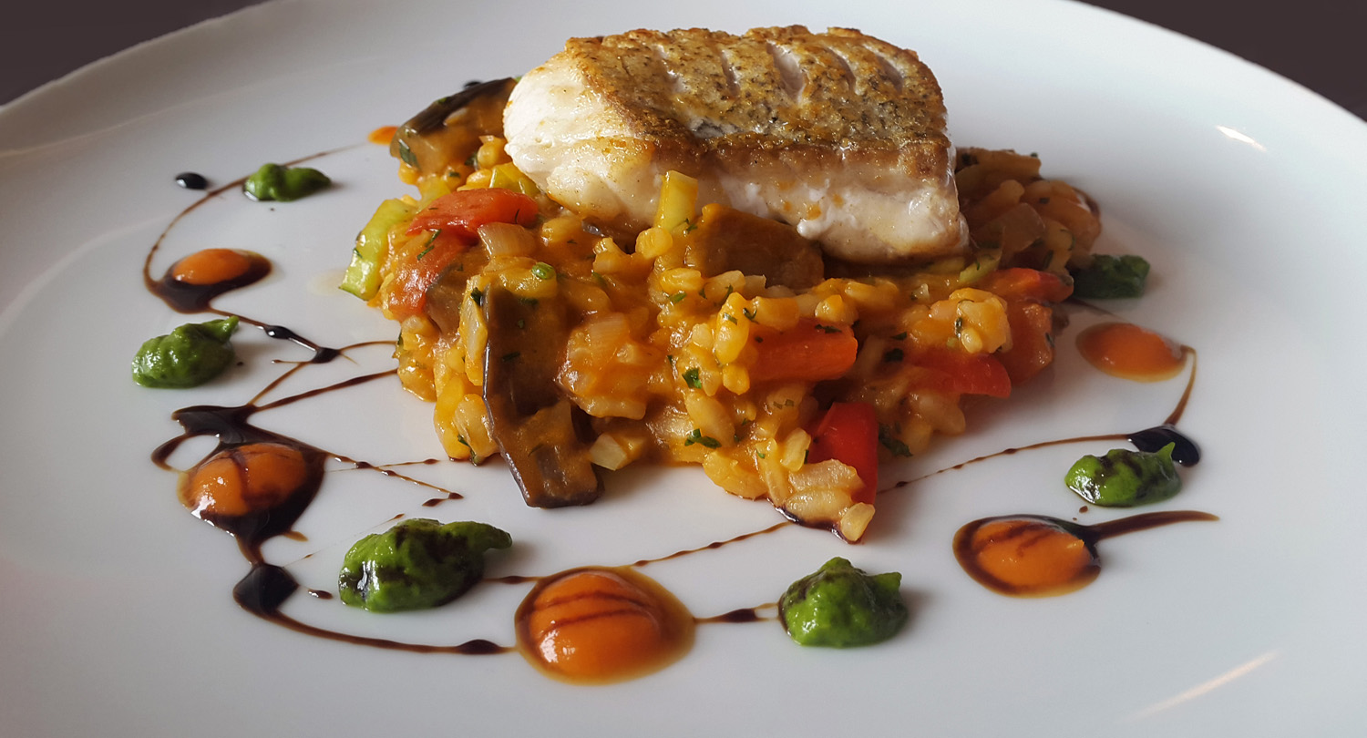 Main course – Fillet of Hake , Risotto of Tomatoes , Aubergine and Peppers with an Italian Pesto dressing.