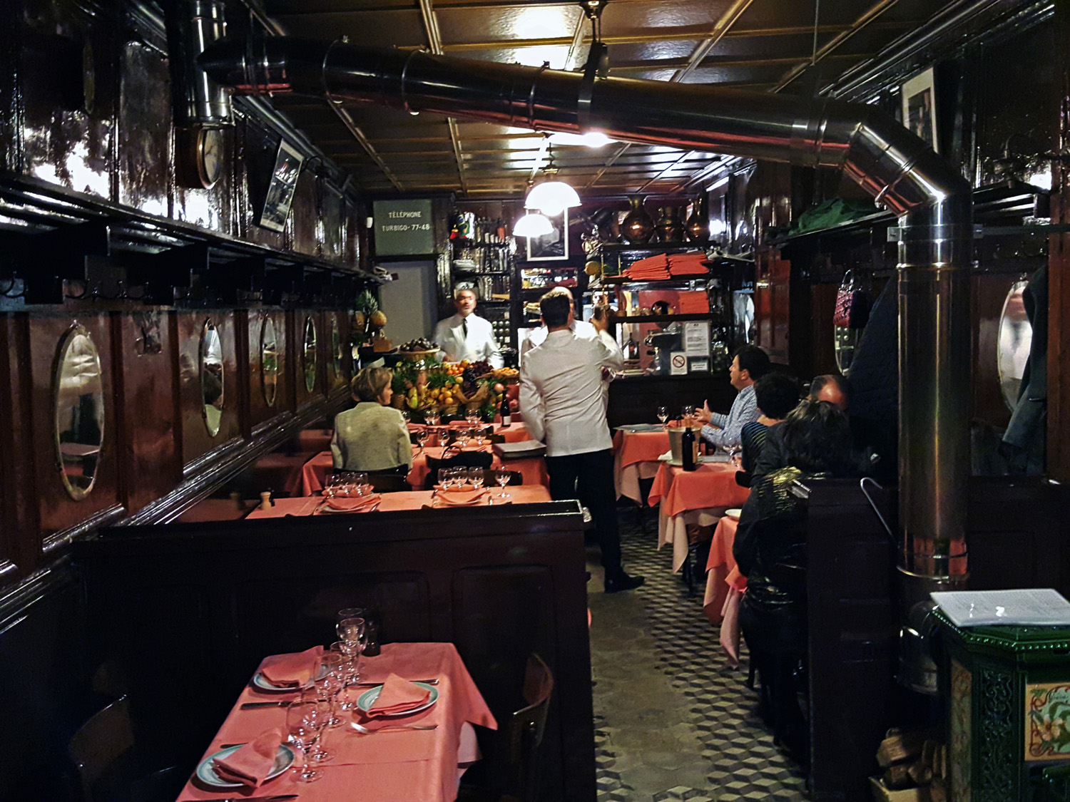 We had already eaten lunch at 3 star Ledoyen and before we knew it we were heading back out to the 3rd arrondissement area and to Chez L`Ami Louis for dinner. I have to admit I had done no research about “The World`s best Bistro” as my dining buddy Finediningexplorer, being the expert had put our culinary weekend together. He had booked L`Ami Louis weeks ahead in order to reserve our weekend table. There`s only 12 tables in the Bistro and apparently they`re scooped up weeks ahead mainly by visitors from the U.K. and USA. Ex president Clinton , Jacques Chirac , Francis Ford Coppola have all eaten there hence the good standing that the Bistro holds on the World stage.
