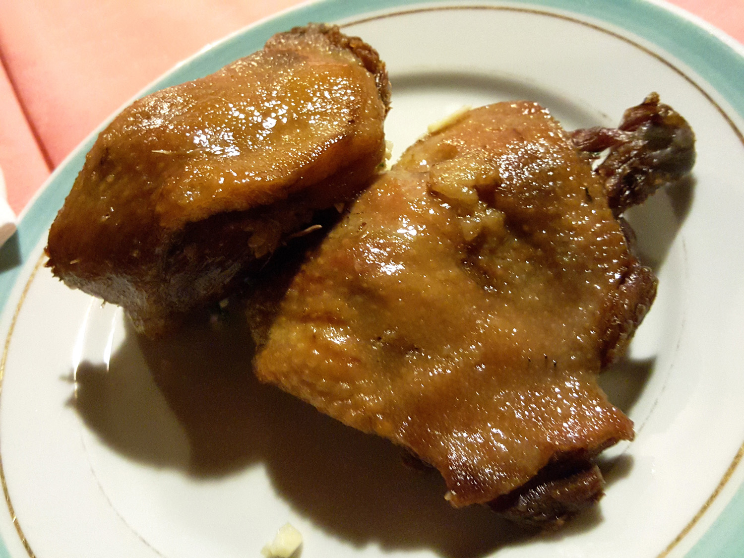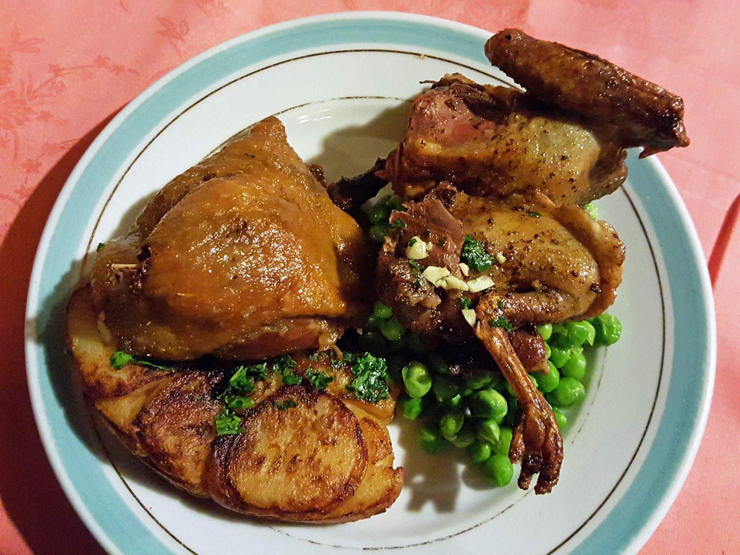 We chose the best of a bad bunch for our main courses. Confit of Duck leg 51 Euro ($58/£40) for 2 legs and also Roasted Pigeon with Petits Pois for 56 Euro ($63/£44). This is exactly how the Duck arrived.
