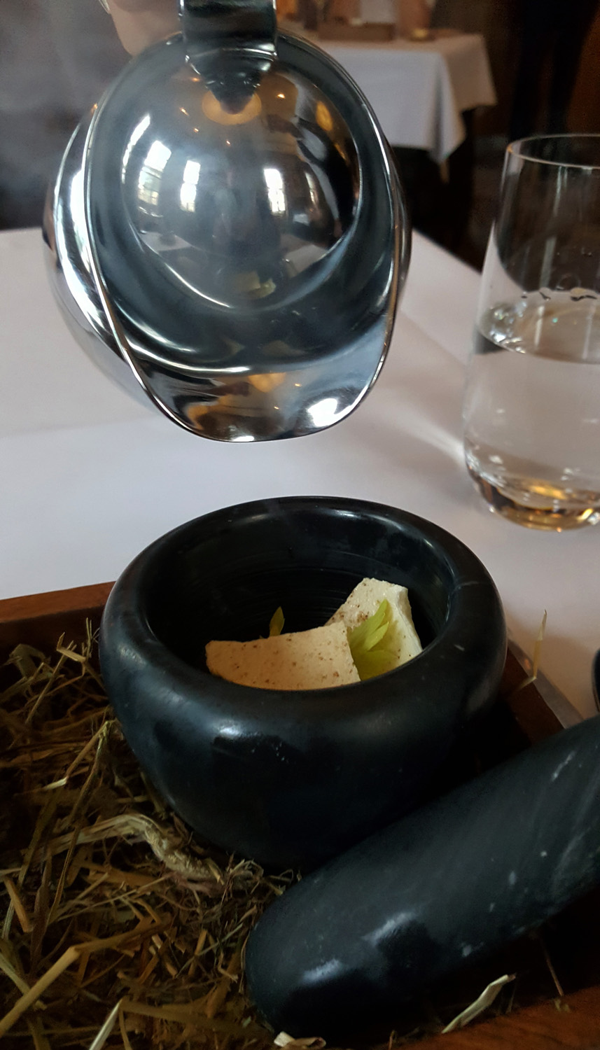 Cryogenic Bloody Mary – An amusing way to begin dinner with a “make your own” Cocktail. Plenty of theatre with the pouring of the liquid Nitrogen , and stirring the potion. A combination of Bloody Mary Sorbet , Celery and Celery Meringue was extremely messy on the plate but carried all the essential flavours of the cocktail and also raised plenty of smiles amongst the diners.