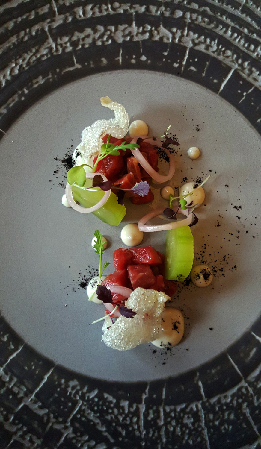 R&J`s Signature Beef Tartare , Crispy Tendons , Cucumber , Charcoal Mayonnaise , Mustard Shoots – Reminded me of Simon Rogans Ox in Coal Oil , similar flavours but needed more punch from the Charcoal as that key smokey flavour was essential but missing from the Mayonnaise.