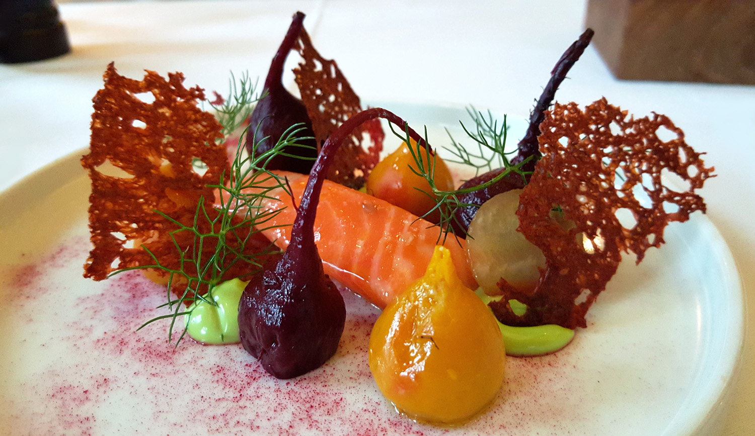 Poached Ocean Trout, Hay smoked Heritage Beetroots , Watercress cream , Beetroot Sourdough – Beautiful , Natural and fresh clean flavours.