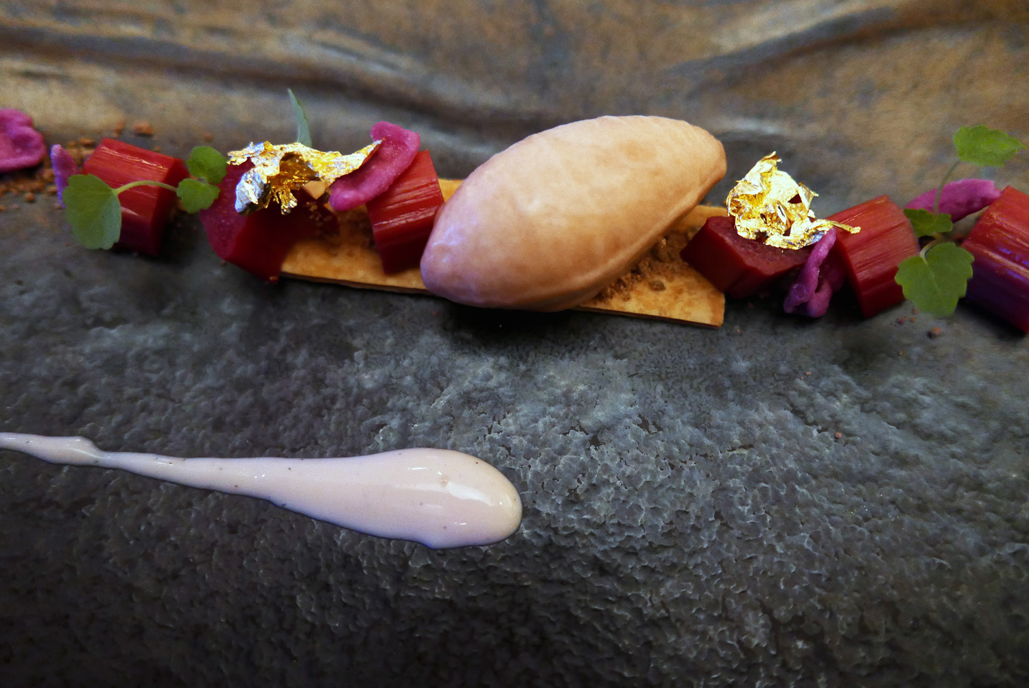 Tomlinson Rhubarb , Poached Rhubarb Sorbet , Candied Rose – Sweet , Tart and sour balanced nicely with a lovely floral addition from the Rose petals. A nice palate refresher.