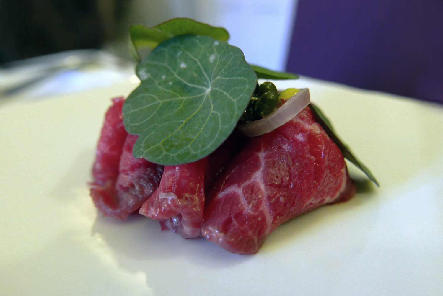 RAW BEEF , NASTURTIUM , BASIL , EBENE CAVIAR – Prime produce simply prepared and presented.