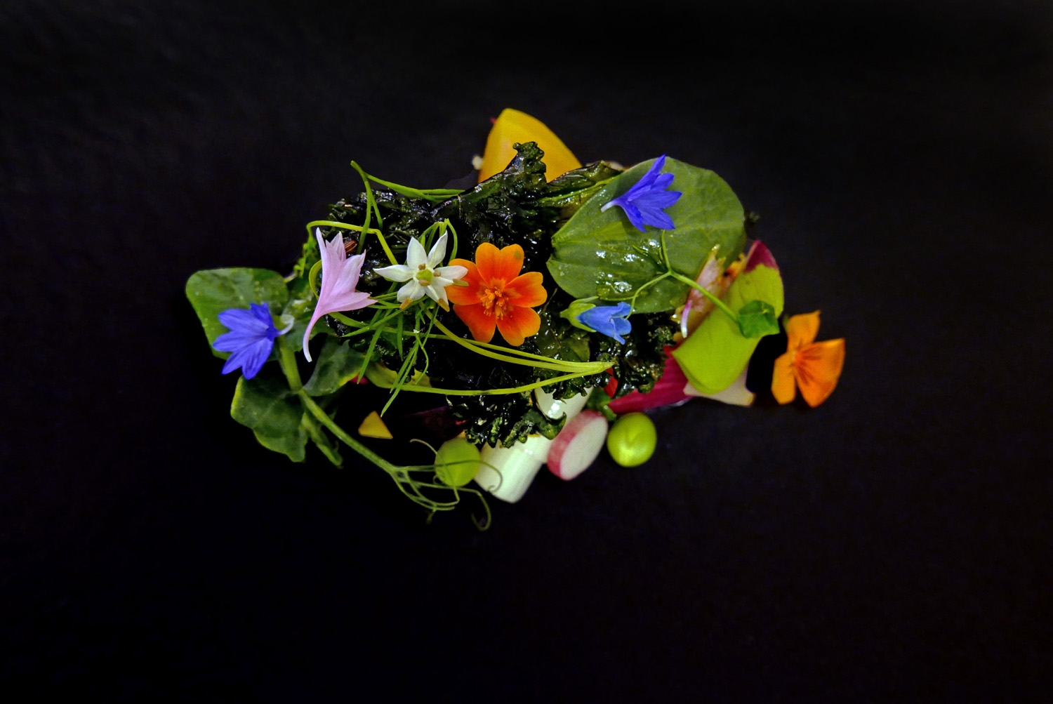 SUMMER SALAD – The highlight of the dinner for me. A Garden salad consisting of the freshest flowers , herbs , leaves and vegetables. Thanks to the UK`s number 1 gardener , the legendary Ken Holland….My God , the man gets everywhere.
