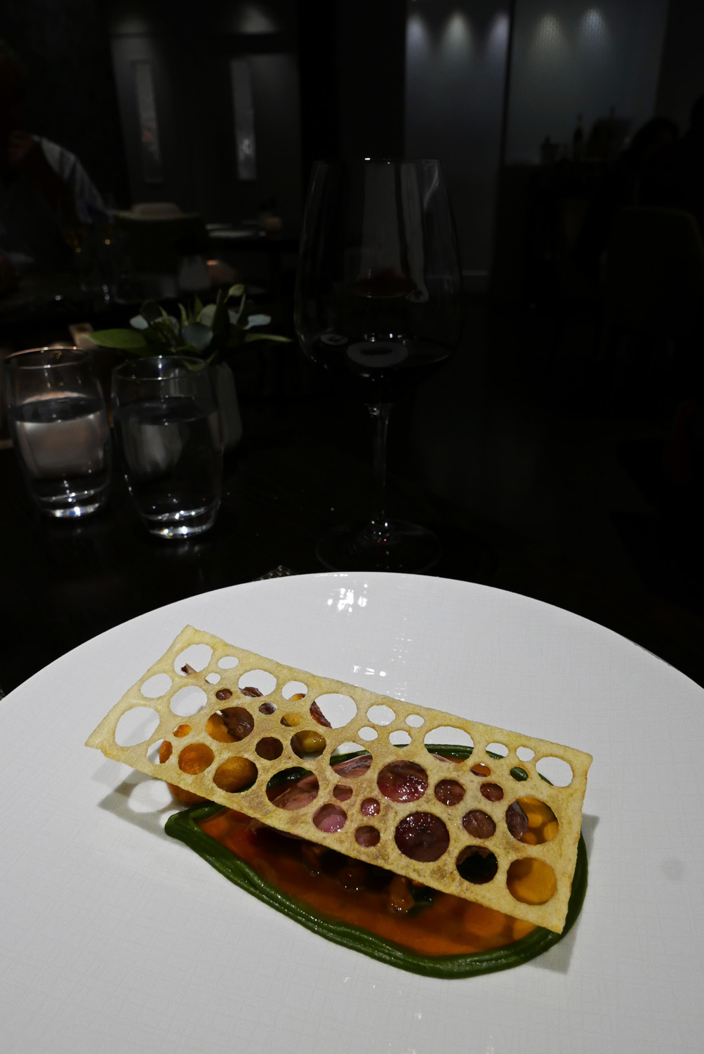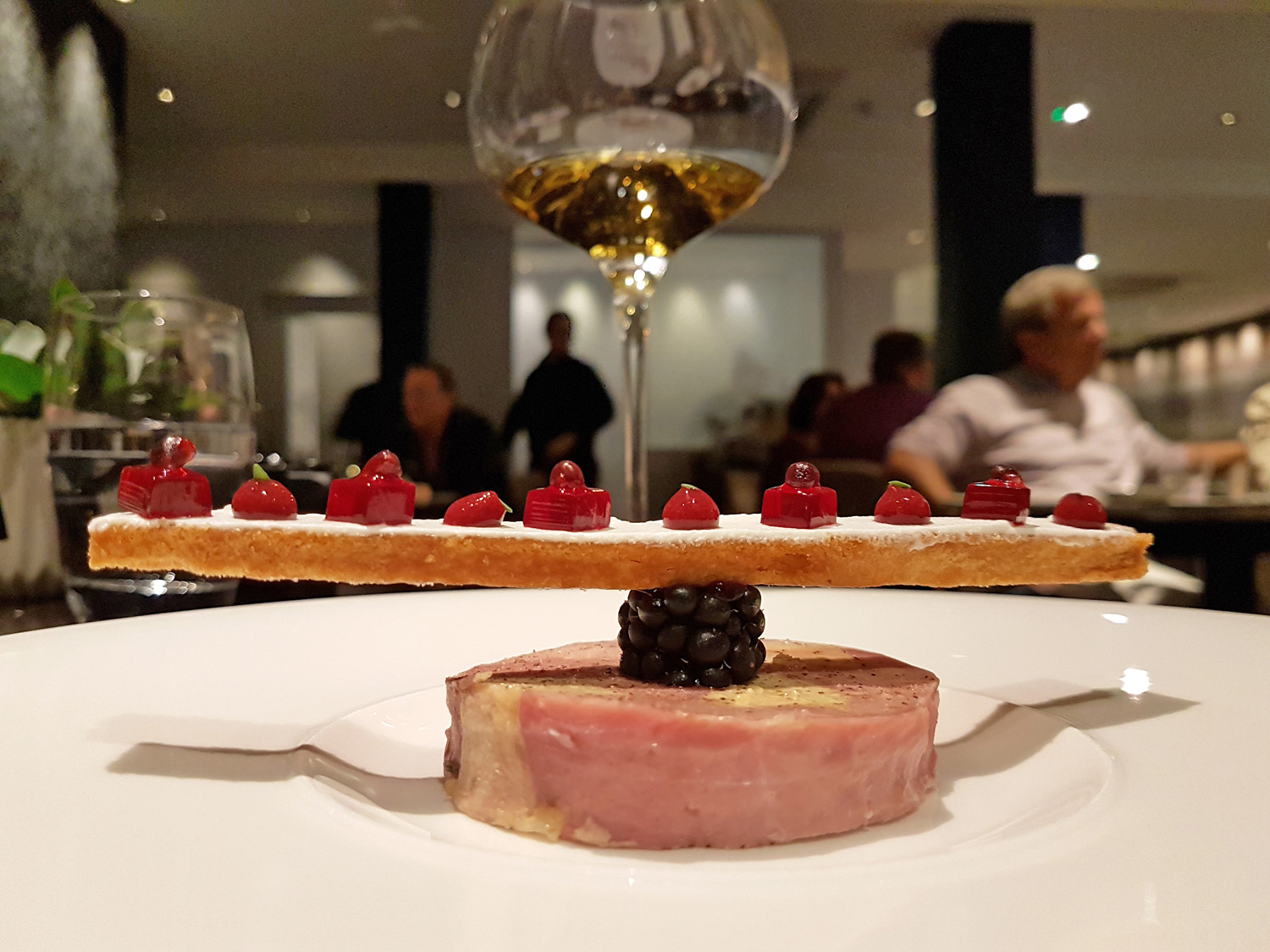 DUCK – Ballotine of wild Mallard and Foie Gras with Scottish Blackberries. A delicate assembly of prime ingredients with an amazing attention to the finest detail. Even the tiniest cubes of tart blackberry jelly were topped with microscopic herb leaves.