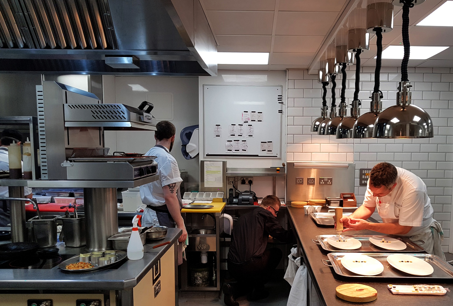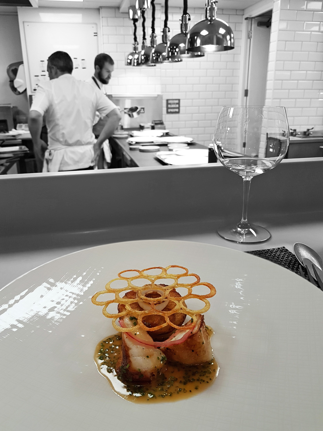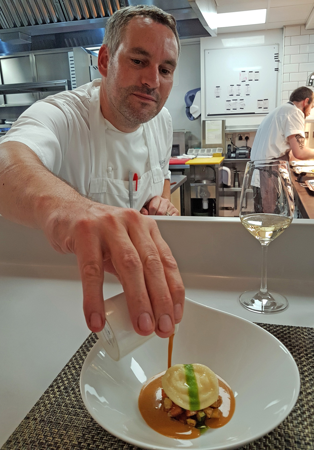 It was at this point where we were both invited downstairs to see the new kitchen. I thought it would be a quick hello and a look around but a total treat lay instore for us. We were shown to Chefs table overlooking the pass. Wines were poured and it was here that we would savour another three courses , chat with Chef and watch the team working. I have to admit , I’ve never seen coordination like this before , the whole team were totally switched on and working in total unison responding to Chef Dominics every command. We were then given a tour of the kitchens to meet the full team at their stations and a look at the amazing little wine cellar stocking some rather precariously balanced extremely expensive bottles of wine. It was lovely to see 2 huge stockpots and to hear that it was part of every evening for one of the chefs to get the stocks on the simmer overnight. Veal and Crab stocks were going on during our visit…Classic techniques and skills that will hopefully never die away.