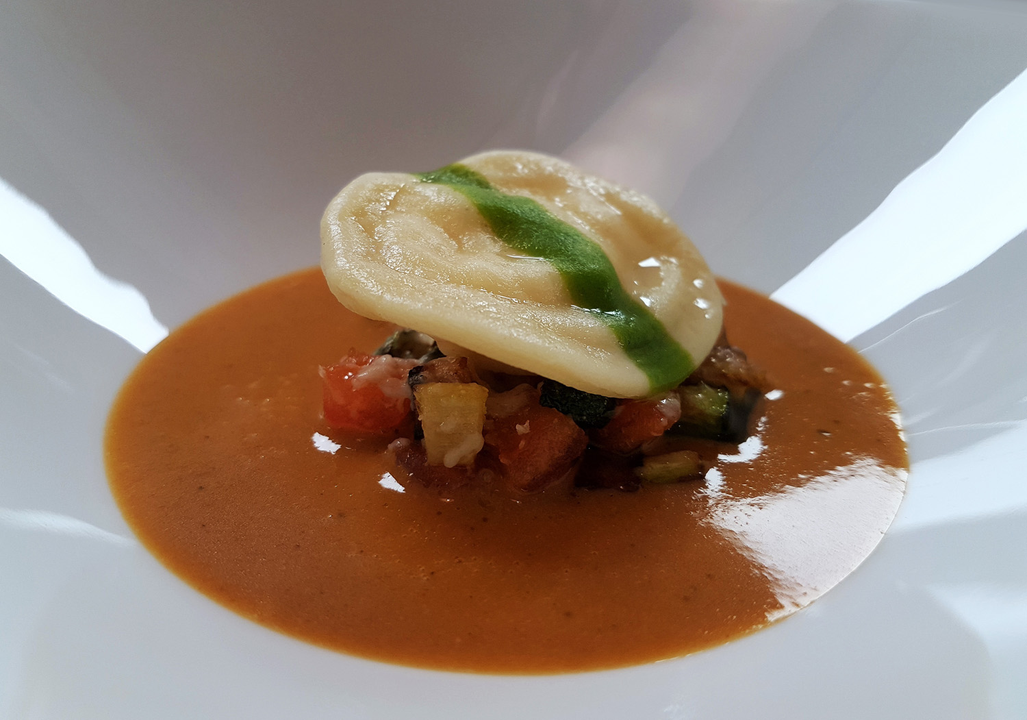 CRAB – Ravioli of Brown Crab from Fingals cave with Minestrone of vegetables, served in its own Bisque.