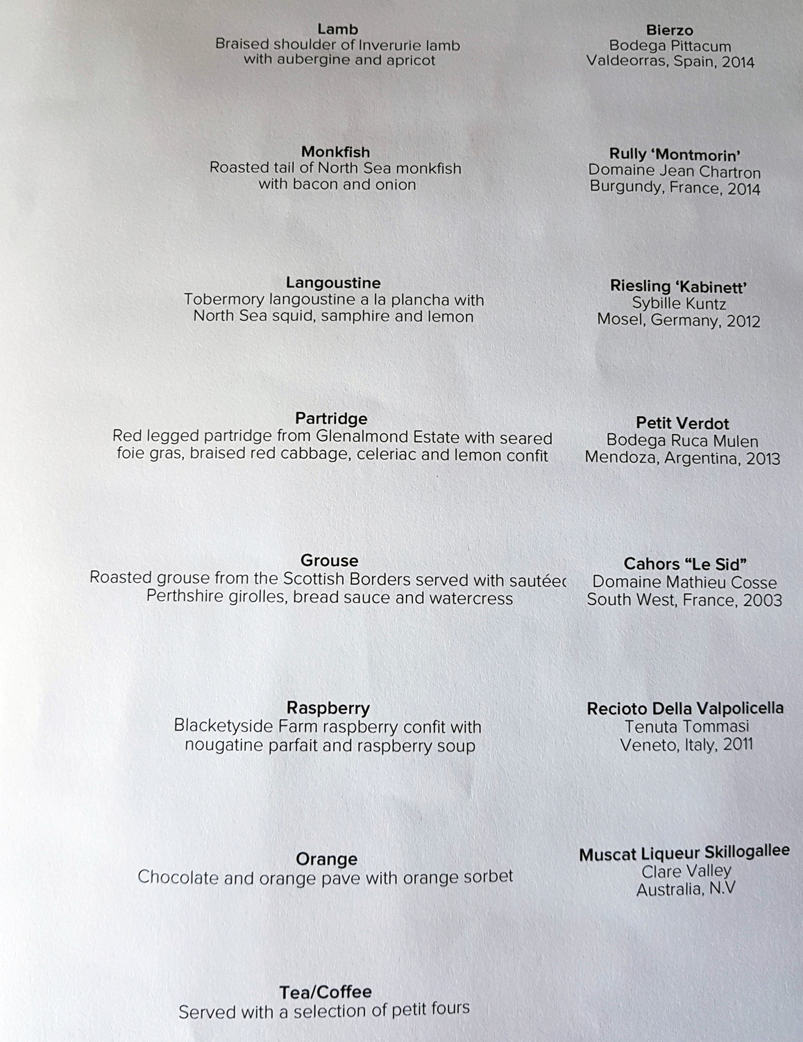 PARTRIDGE – Red legged Partridge from Glenalmond estate with seared Foie gras , braised Red Cabbage , Celeriac and Lemon confit. Finally main course arrived. I had to request a split main course at this point as I was ready to explode. My wife got the lighter Partridge whilst I got stuck into the Grouse. The presentation on both dishes was fantastic , classic Parisian and top shelf robust flavours. I ended up eating most of my wifes Partridge which was definitely my favourite of the two. Partridge ,Foie gras , sweet red cabbage and Lemon confit…..what a stunning combination when eaten together.