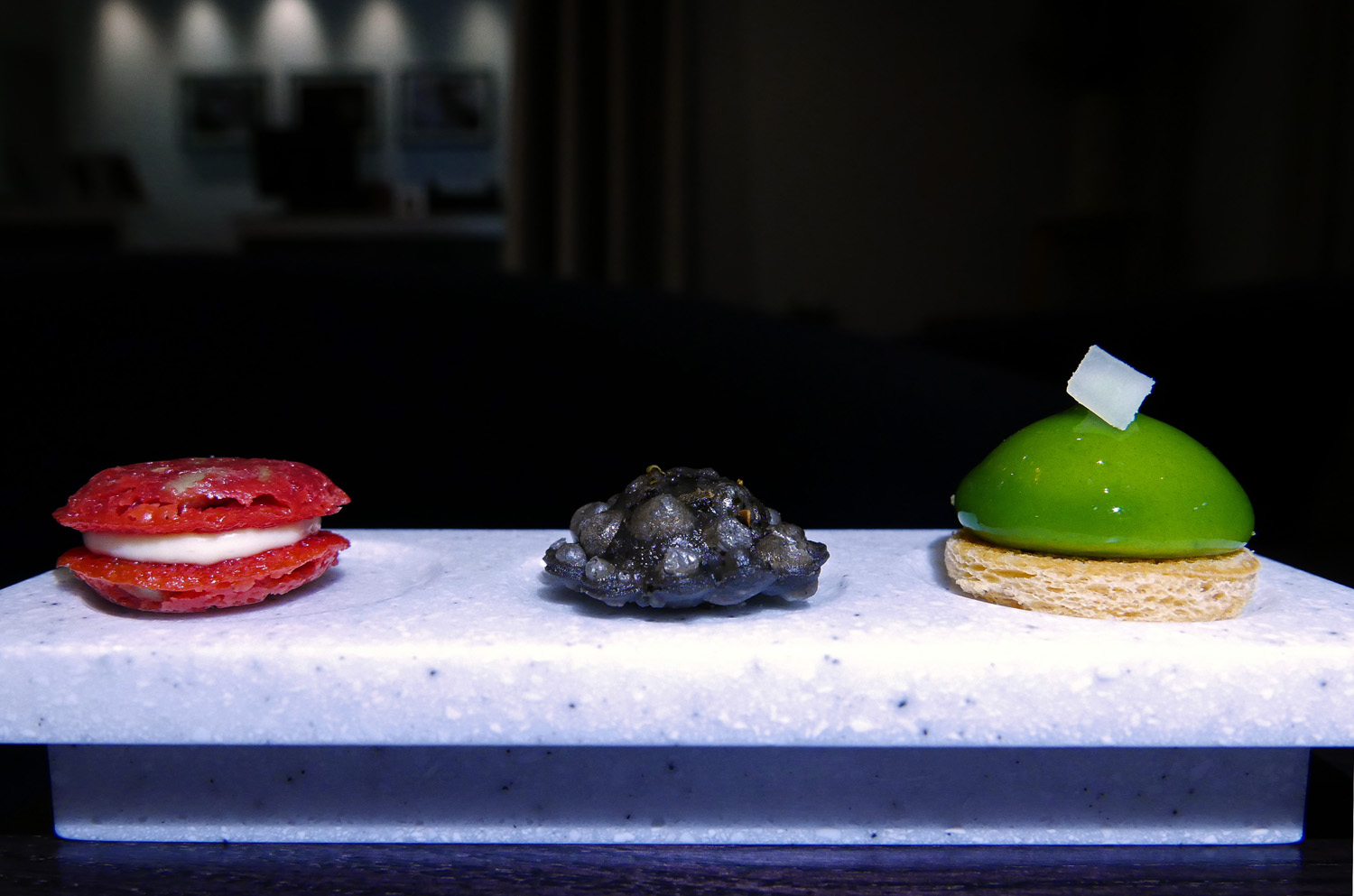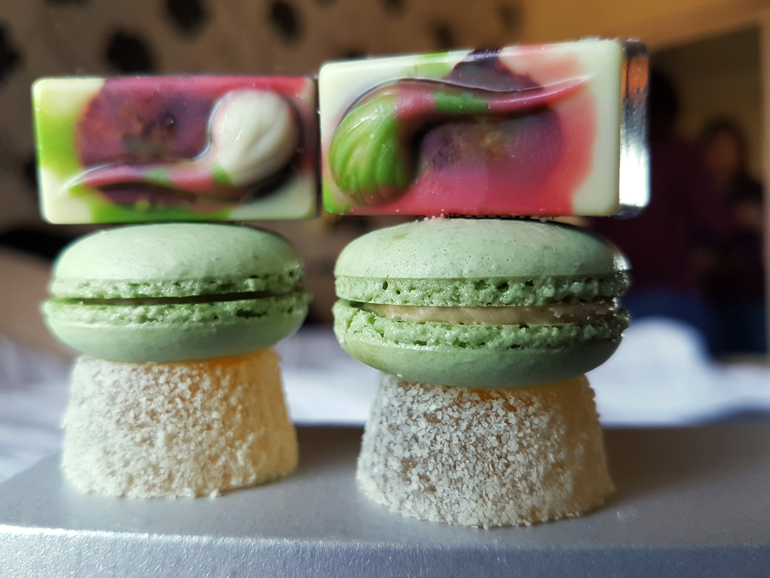 SELECTION OF PETITS FOURS – Truffle , Macaron and Pate de fruits. Full to the limit we took these little treats back to the hotel to eat for Breakfast.