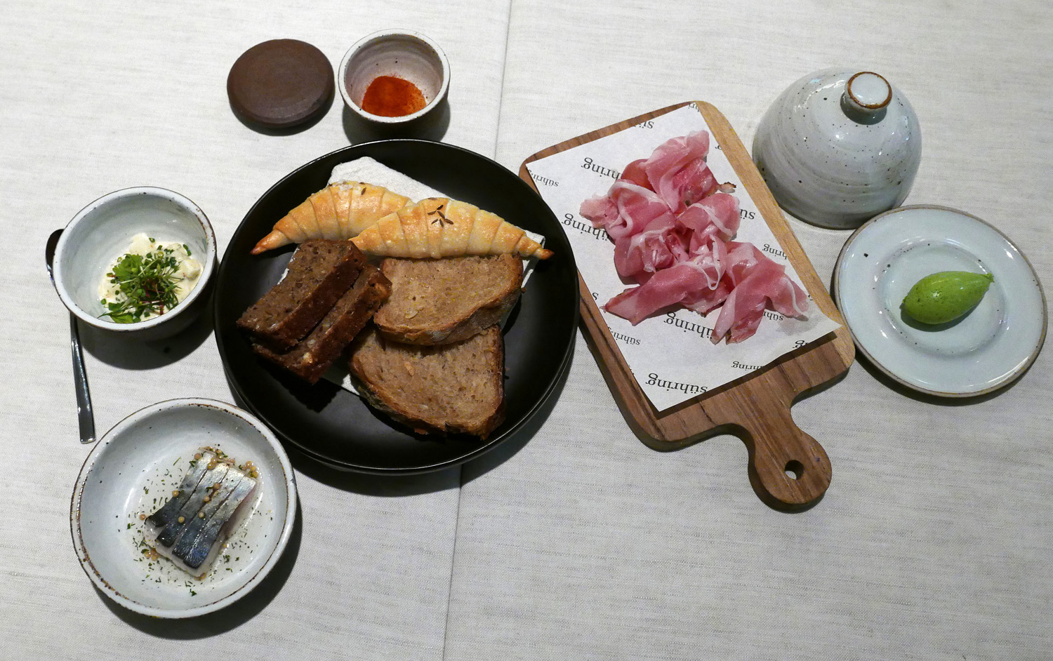 Rustic Sourdough Breads baked over open fire / spreads and cold cuts. (Black forest ham)