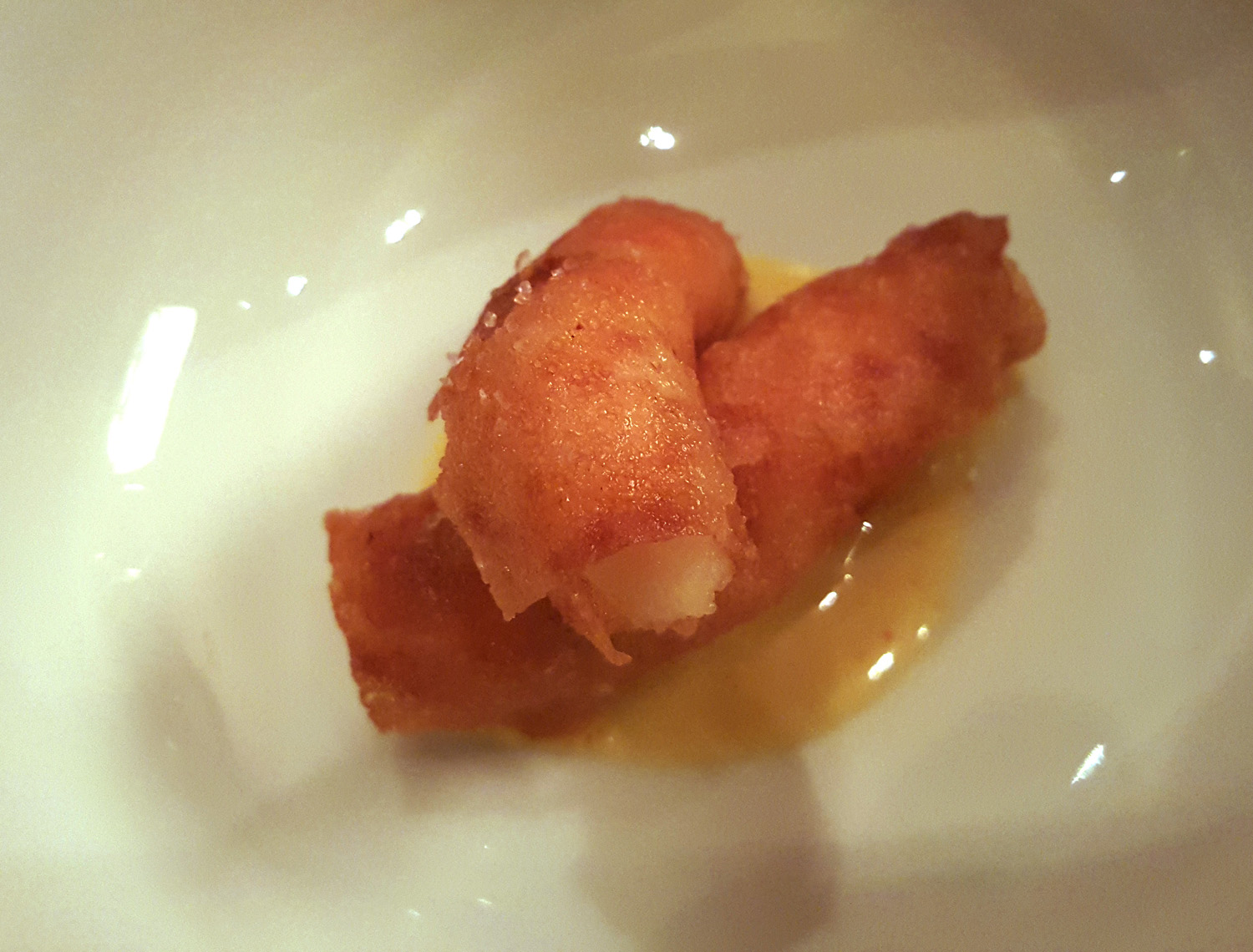 Deep fried Langoustine in a crispy coating with a sweet tasting fruit sauce dip.