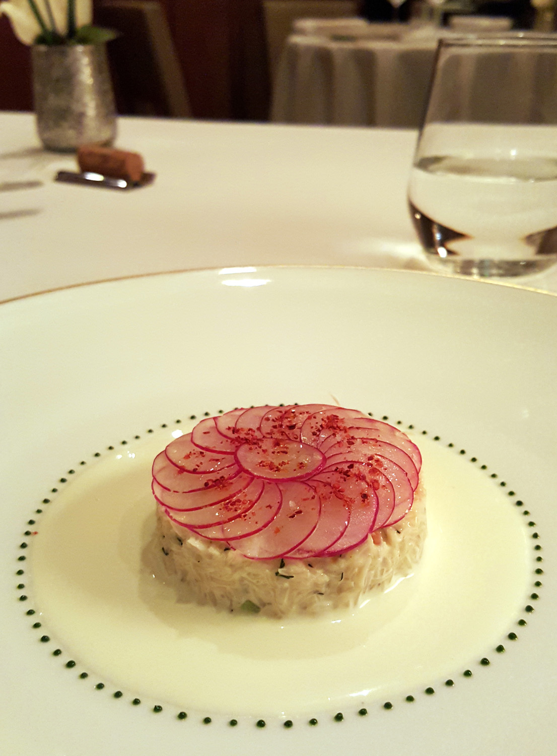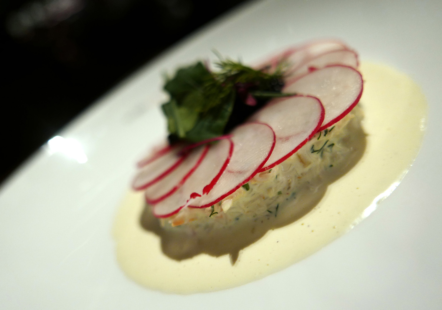 Finely slices slivers of fresh Radish topped a Lemony Remoulade of Crab meat. Attention to detail was amazing.