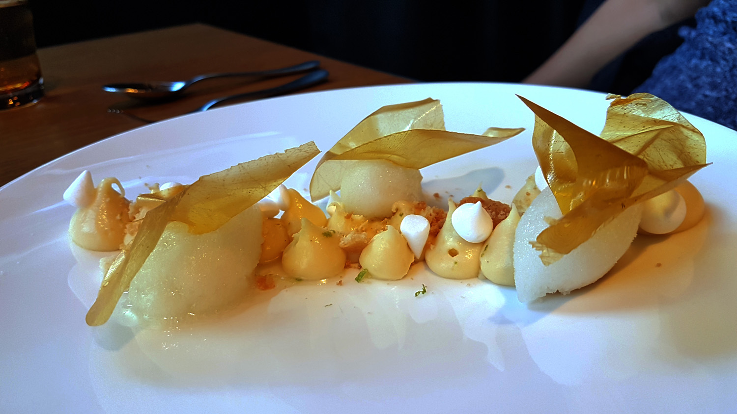 “Coco Mango” – Coconut Mousse , fresh Mango , exotic fruit coulis and Coconut Sorbet . A very skilled and well put together dessert for £11
