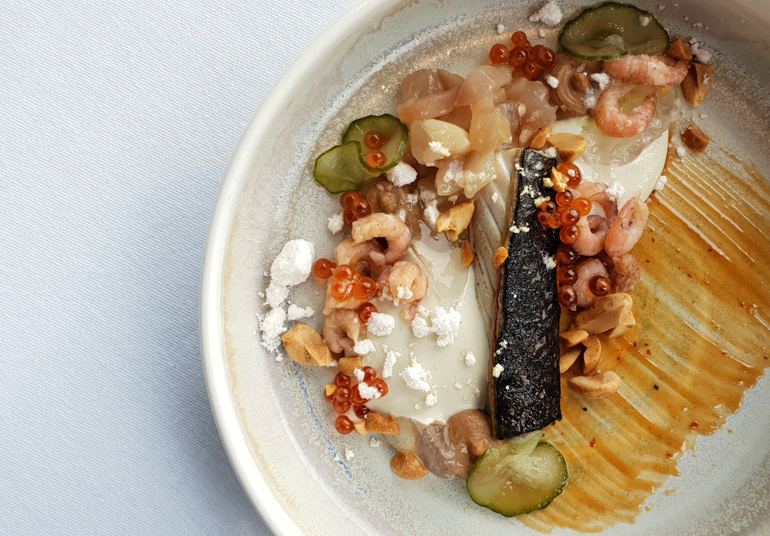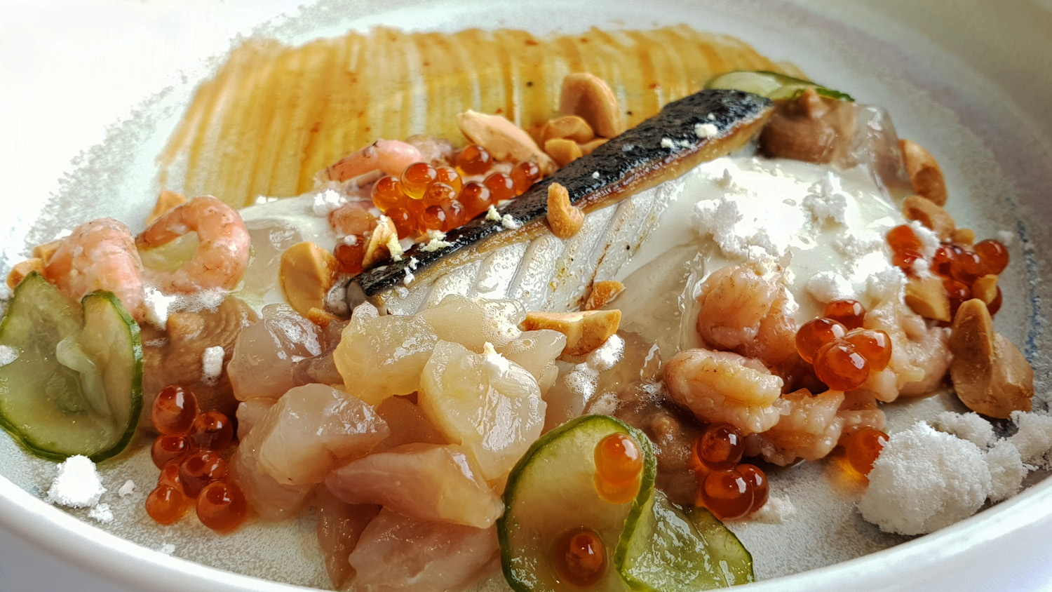 MACKEREL – Torched Mackerel , Brown Shrimp , Satay sauce , Pickled Cucumber. An enjoyable course but too many components ( I counted 10 ) on the plate which was quite confusing.
