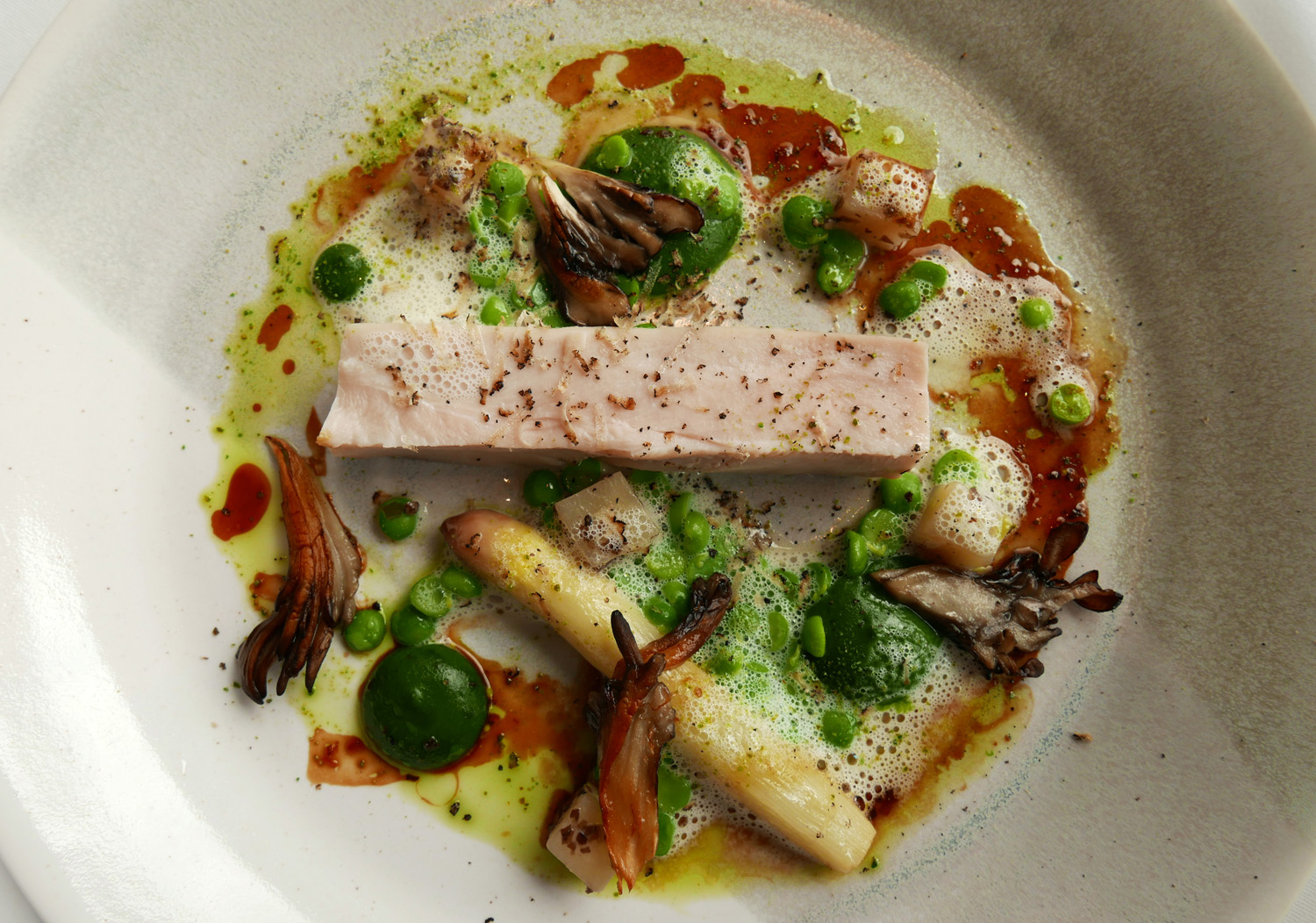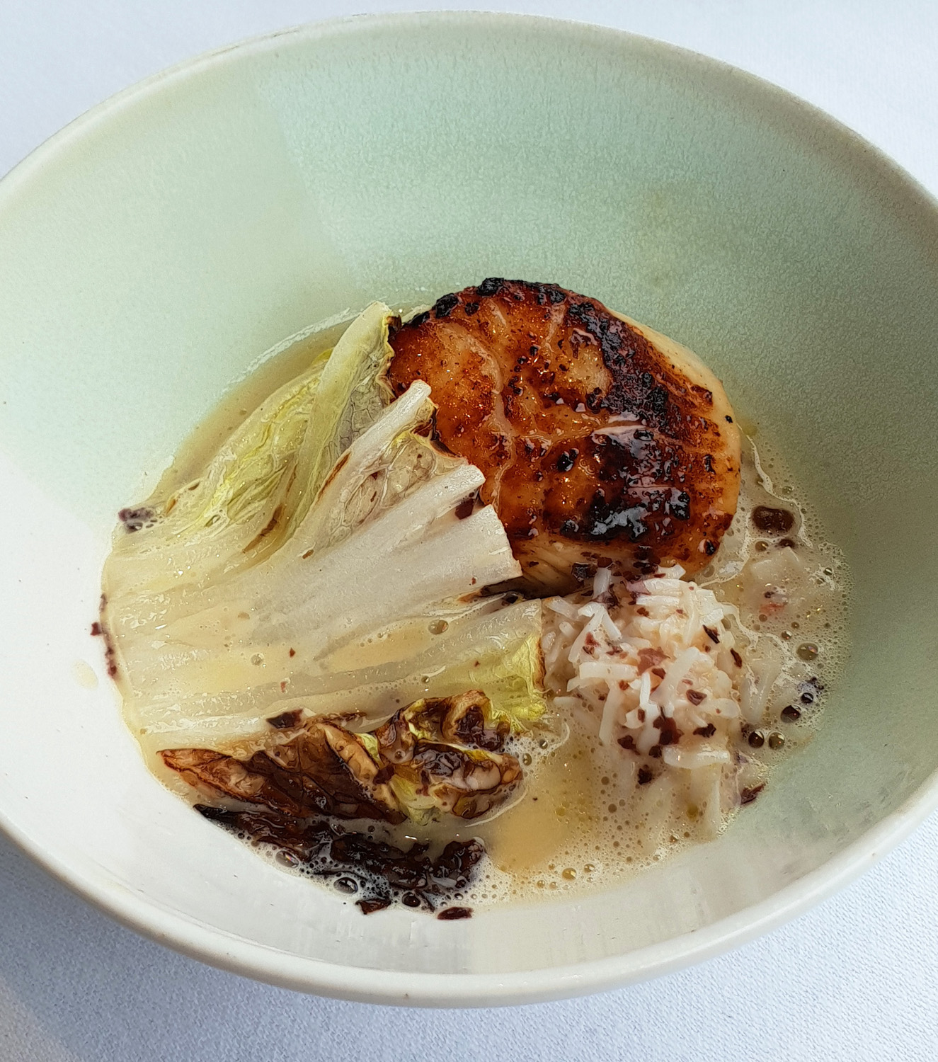 SCALLOP – Confit Scallop , Salcombe Crab , Charred Cabbage , Shiso . A dish which was Salty ( in a good way ) , Creamy , with a perfectly Caramelised and cooked King Scallop. Classic cooking well executed.