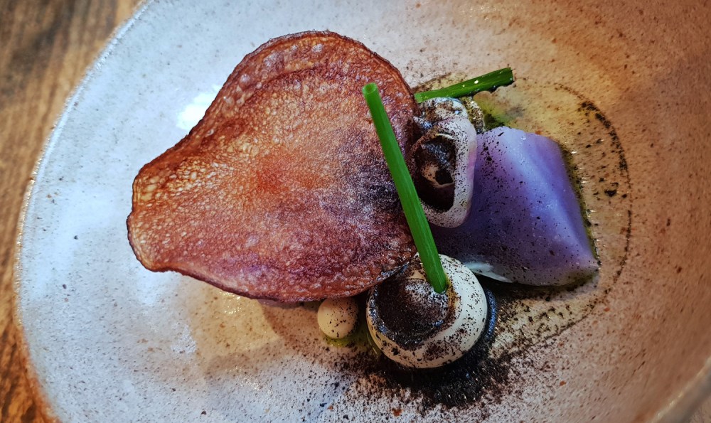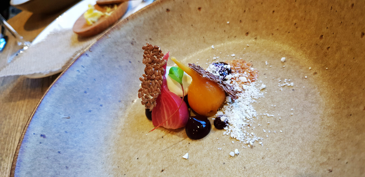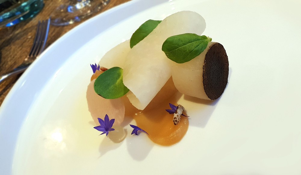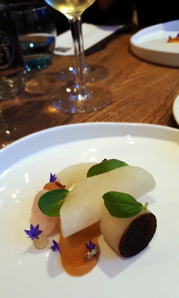 VEGETABLES – YORKSHIRE KOHLRABI , BURNT APPLE , YUZU- The seasonal fruit and veg were cooked well but the overall dish needed a “fat” boost , a cream/mayo/emulsion/mousseline / crème fraiche / curd cheese type element would have complemented the Apple and Kohlrabi beautifully.