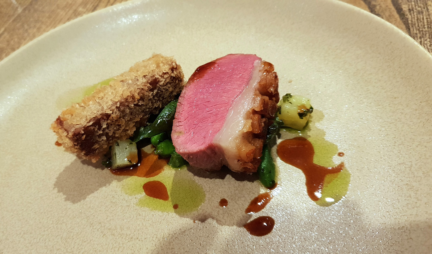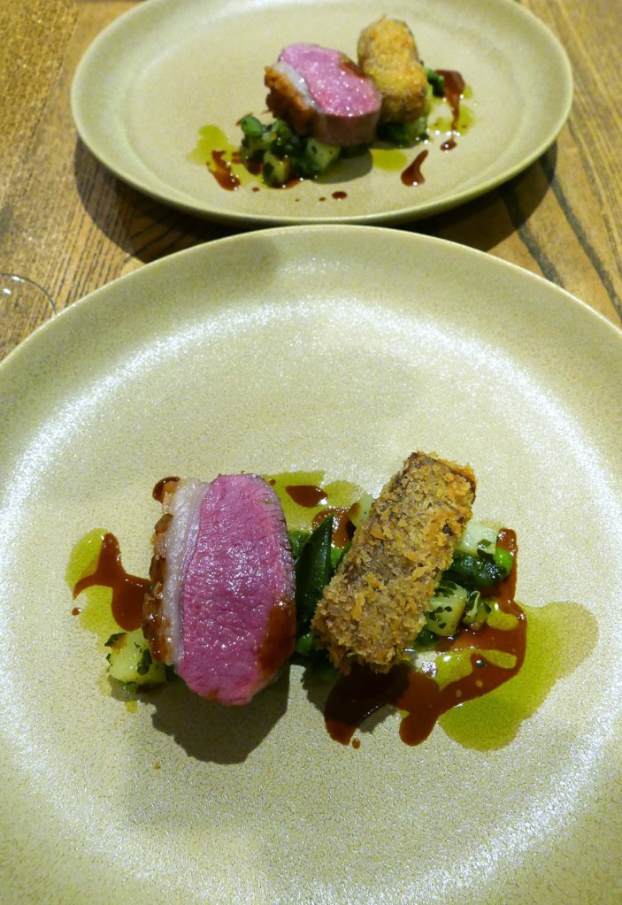 LAMB – LAMB FAT POTATOES , RUNNER BEANS , GREMOLATA – Lamb was cooked to perfection , the seared fat was amazing . Just needed another few slices as it was so good. Best course of the evening for both of us.