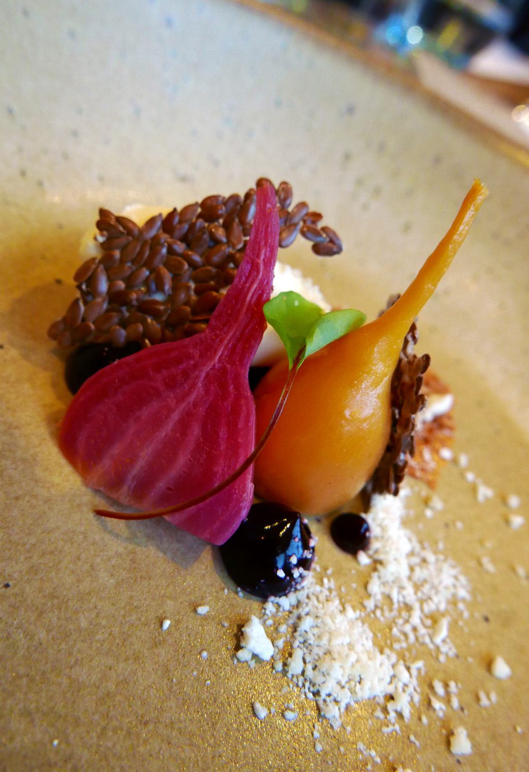BEETROOT , RAGSTONE AND LINSEED – Nice classic combination of tart Red and Yellow Beets , creamy Cheese and nice texture from the linseed cracker.