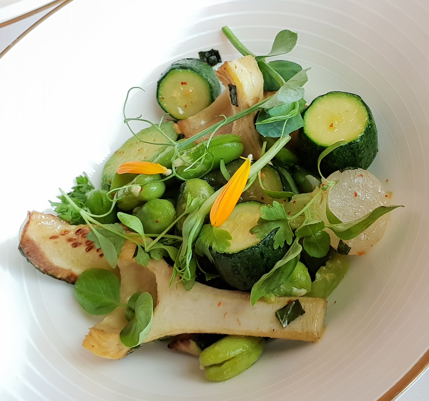Cutlet and fillet of British Lamb , Courgette & Basil puree , a selection of summer vegetables , Lamb sauce. – Not the usual Ritz gourmet main course but still an enjoyable, well cooked seasonal plate of food