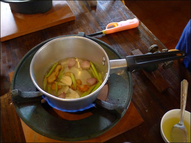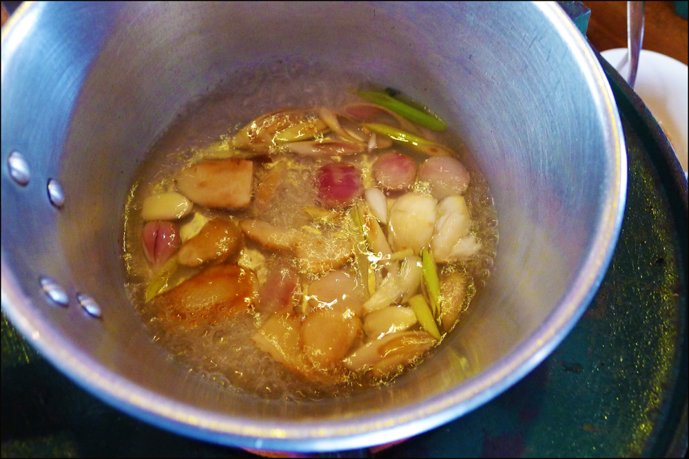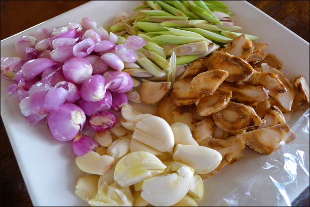 Young Galangal ( ginger as a substitute )……. Sliced ( about 1-2 tbsp )