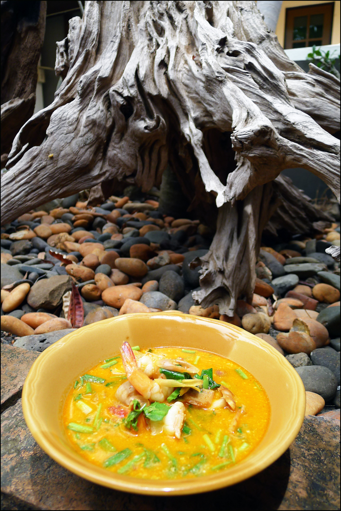 ‘Tom’ in Thai means to boil but when it`s used in relation to food dishes it means soup. ‘Yam’ means sour .Tom yum is usually made with prawns ( tom yum goong), Chicken (tom yum Gai), fish (tom yum pla), or mixed seafood (tom yum talay).Tom yum is always characterized by its distinct hot and sour flavours with fragrant herbs generously used at the very end of cooking. The basic broth is made of stock and fresh ingredients Lemon grass ,Kaffir lime leaves, Galangal, Lime juice, fish sauce and crushed chillis.