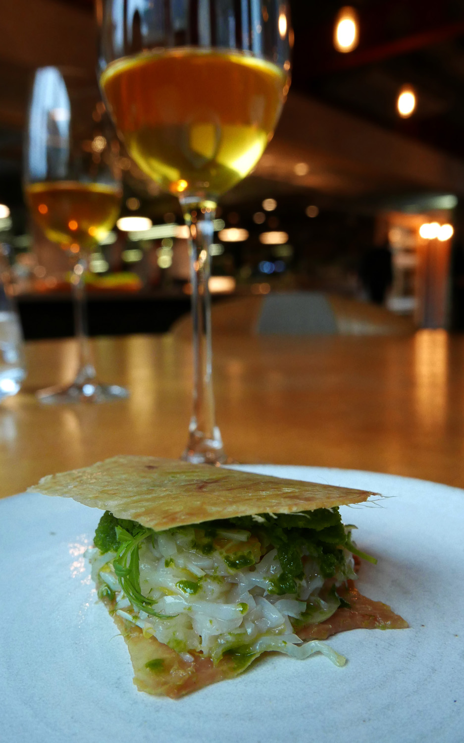 Crisp Chicken Skin , Crab , Sorrel and Gold rush Apple Juice.