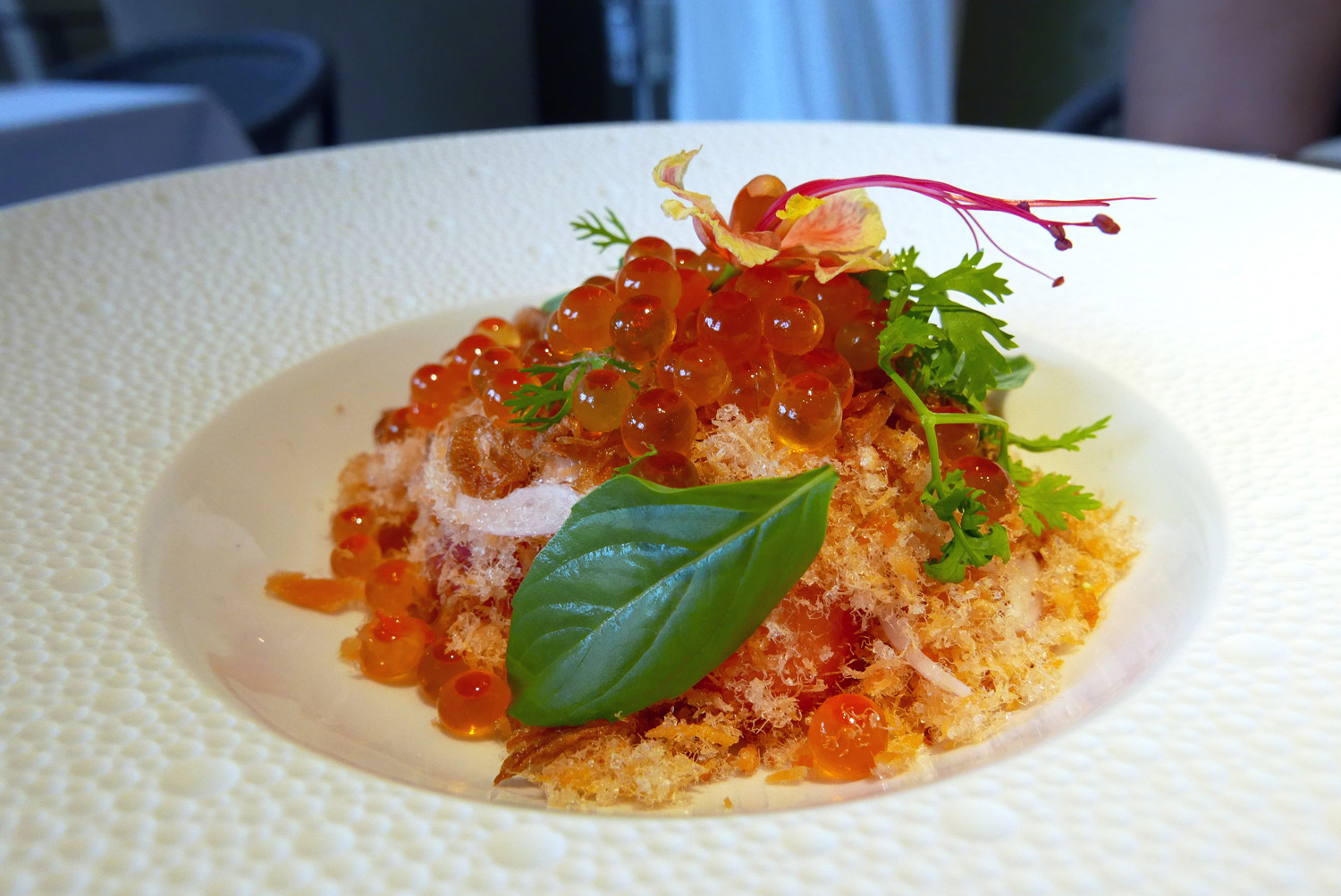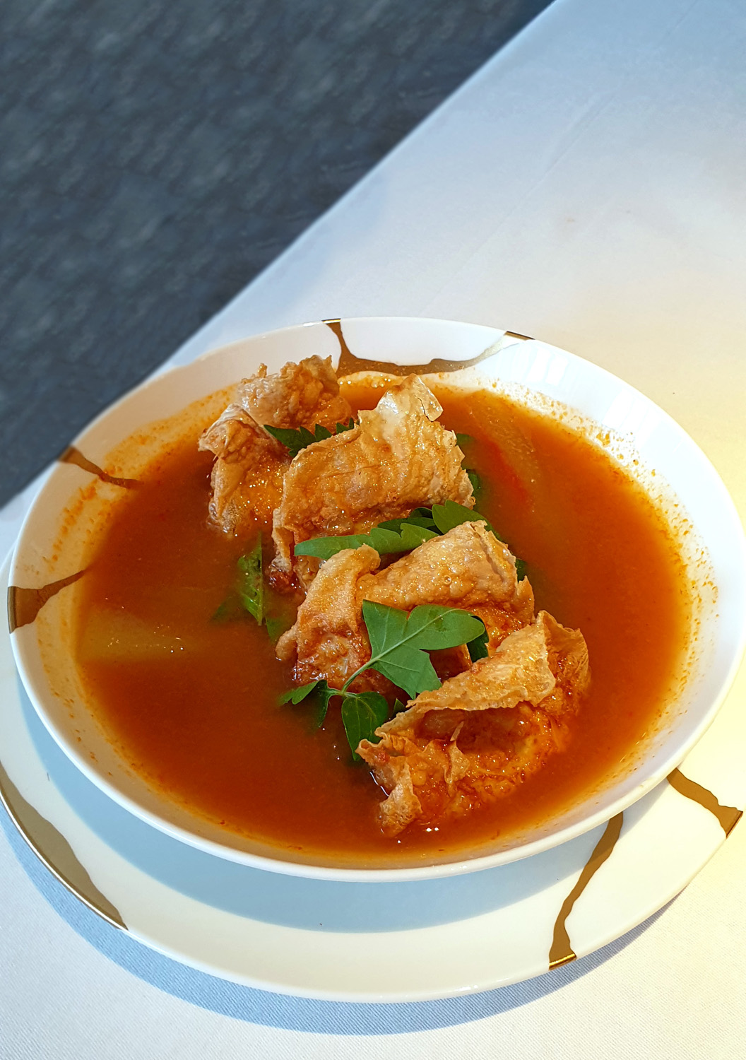 Loin of Spanner Crab , Nan Province salted Duck Egg , fresh Coconut Milk , hairy Eggplant and Lime Leaf.