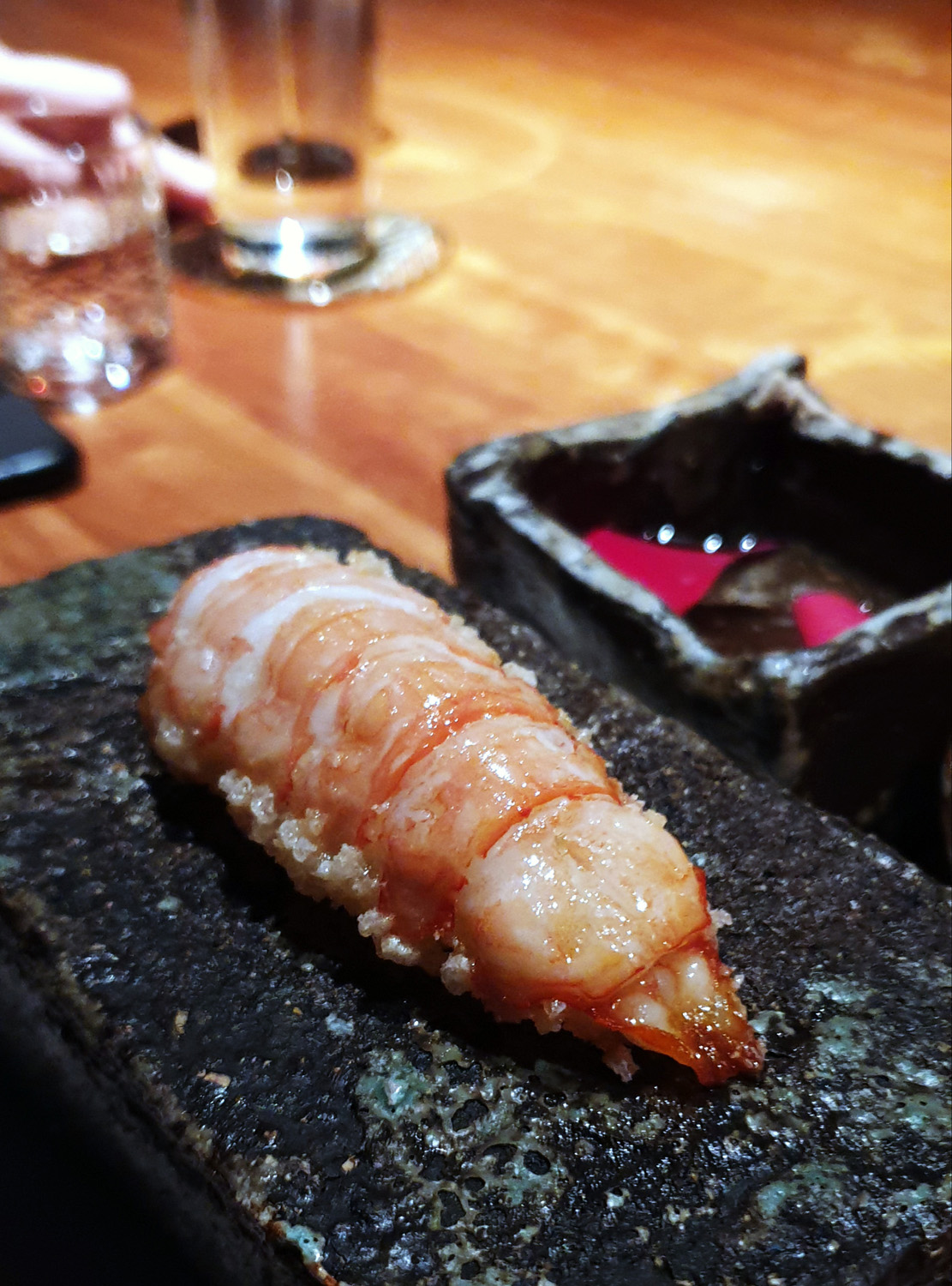 Norwegian Langoustine , Crispy Rice (Koshihikari) and emulsion of Galangal & Matsutake.